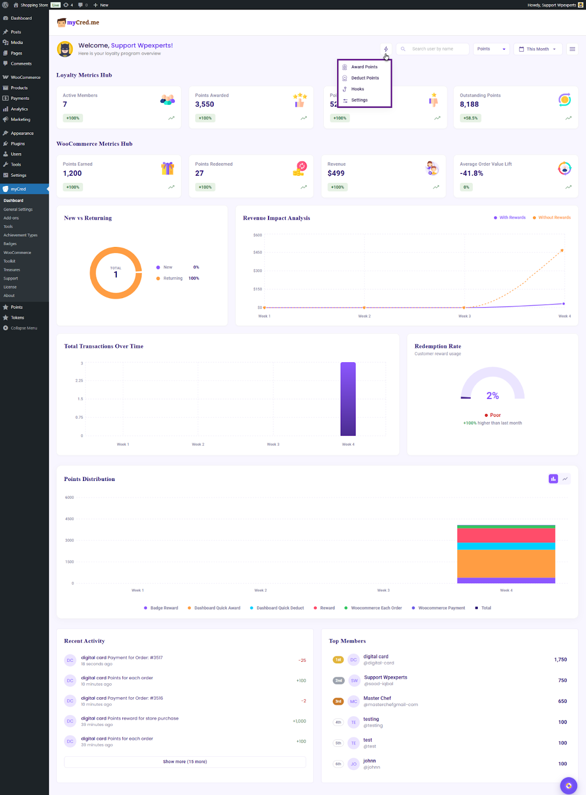 To facilitate the administrator, the Quick Actions menu has been introduced. The menu includes Award Points, Deduct Points, Hooks, and Settings.