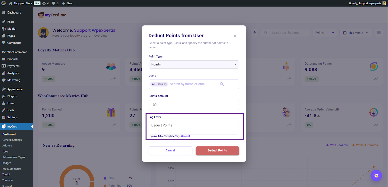 - To verify that points were deducted from all users, check the hooks by navigating to the Admin Dashboard > Points > Log.