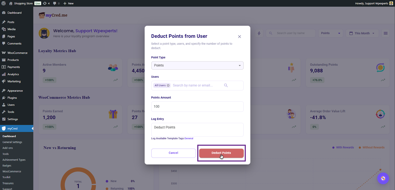 - Enter the username of the user you want to deduct points from. In this case, we are deducting points from all users.