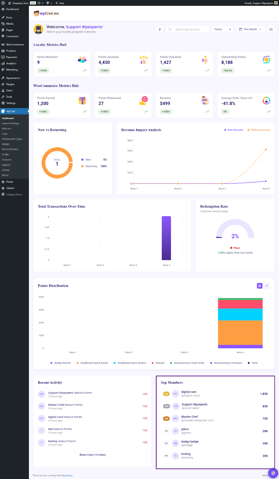 The Top Members section displays the highest-ranking members of the loyalty program based on the selected point type from the Point Type filter.