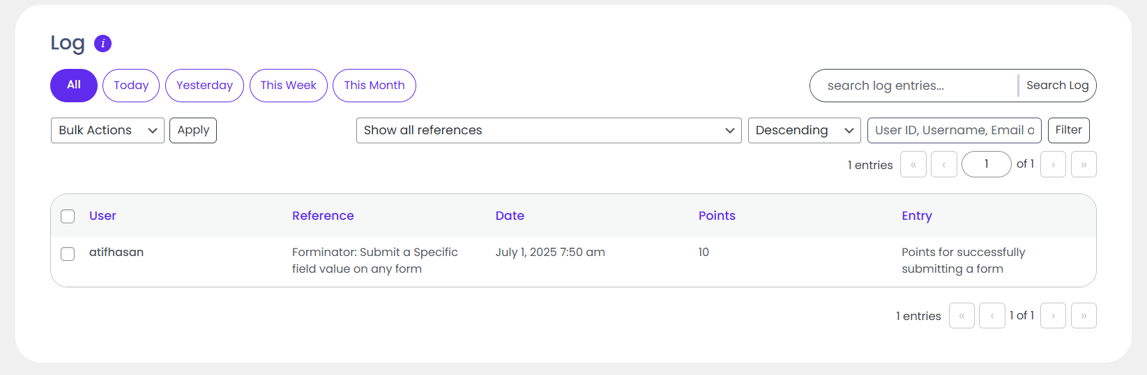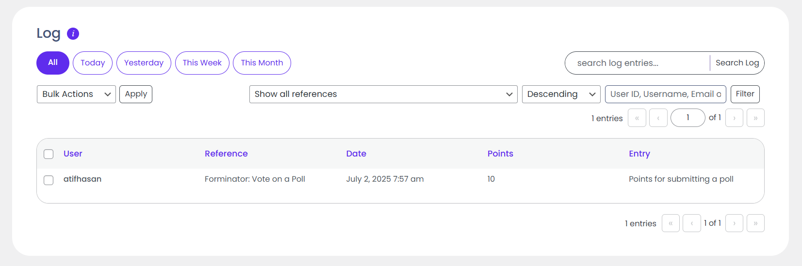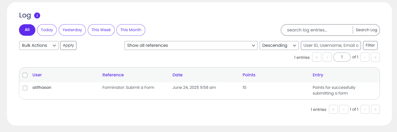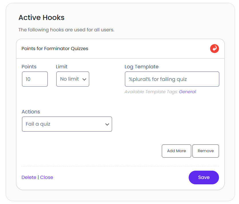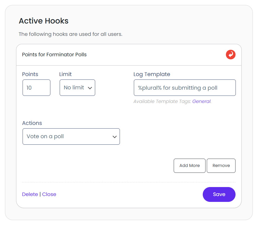 Log: Each time a hook awards or deducts points from your users, a log entry of this event is saved to your log. What is saved to the log is determined by the log template.