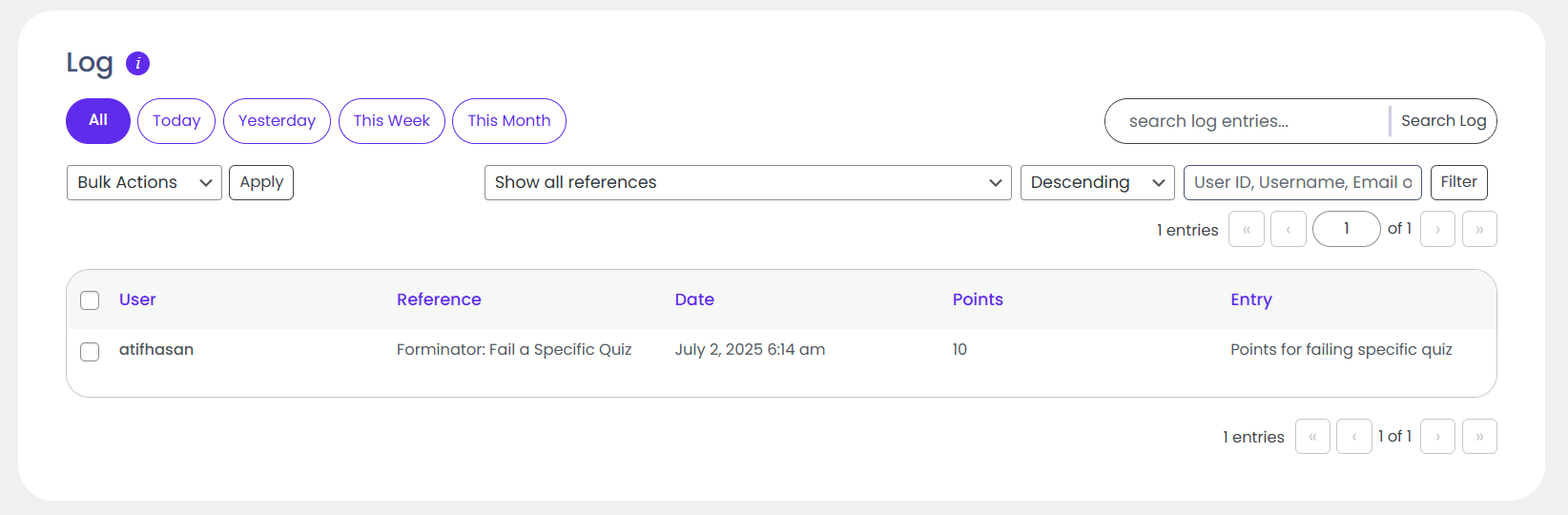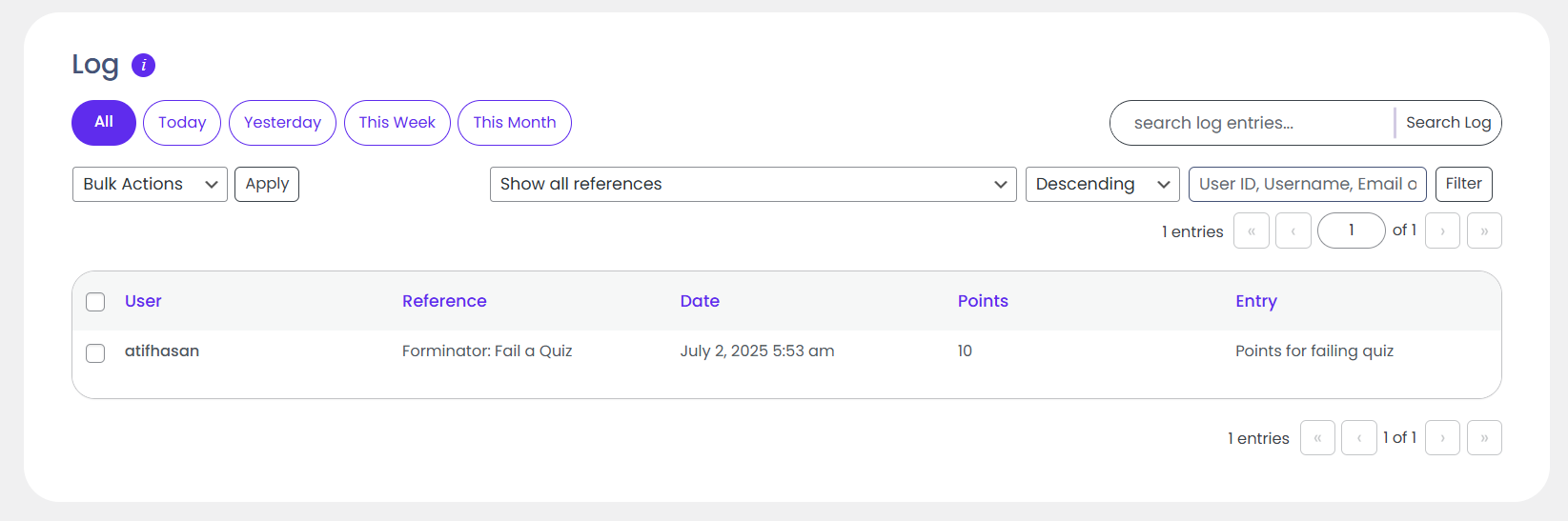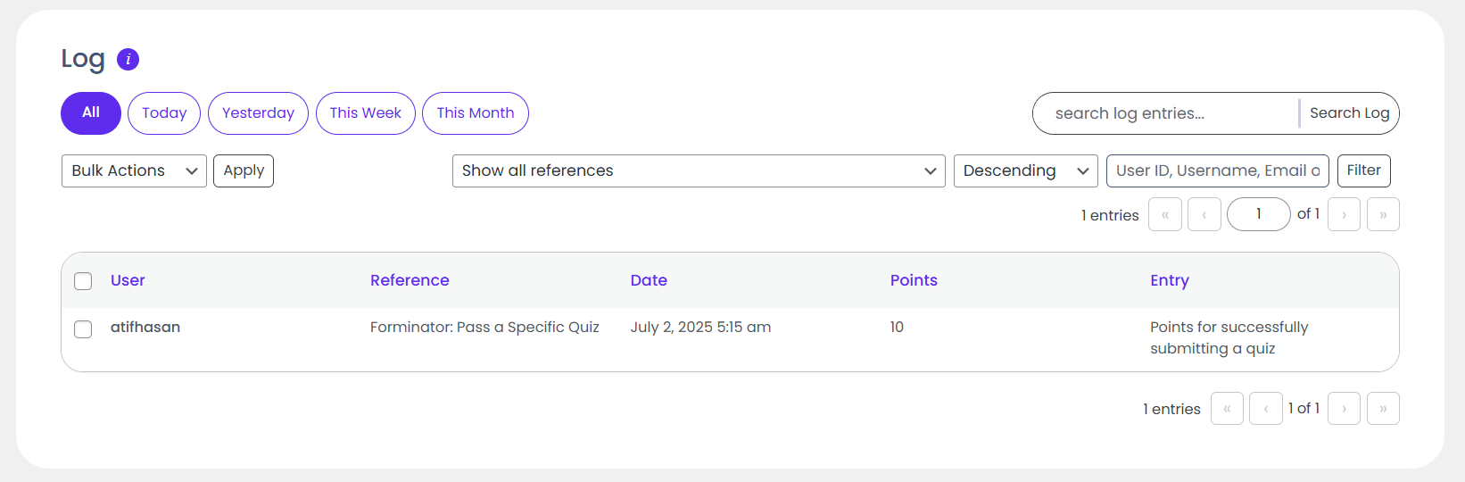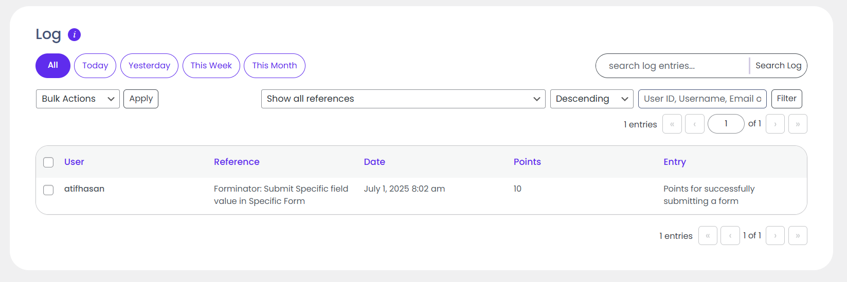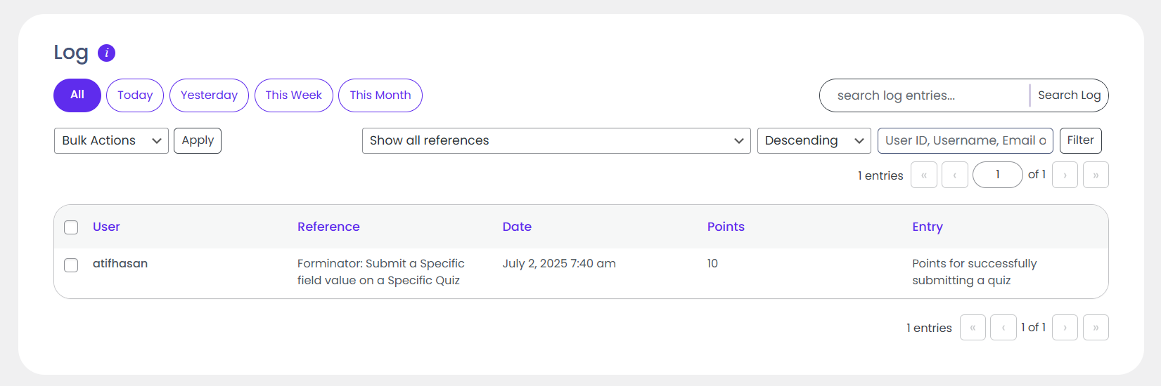 Log: Each time a hook awards or deducts points from your users, a log entry of this event is saved to your log. What is saved to the log is determined by the log template.