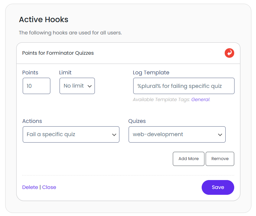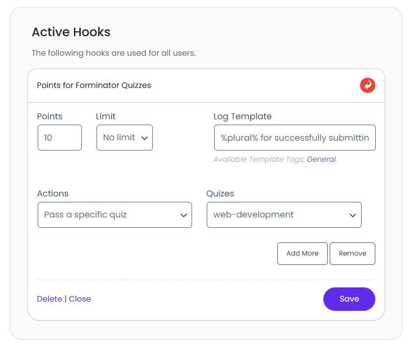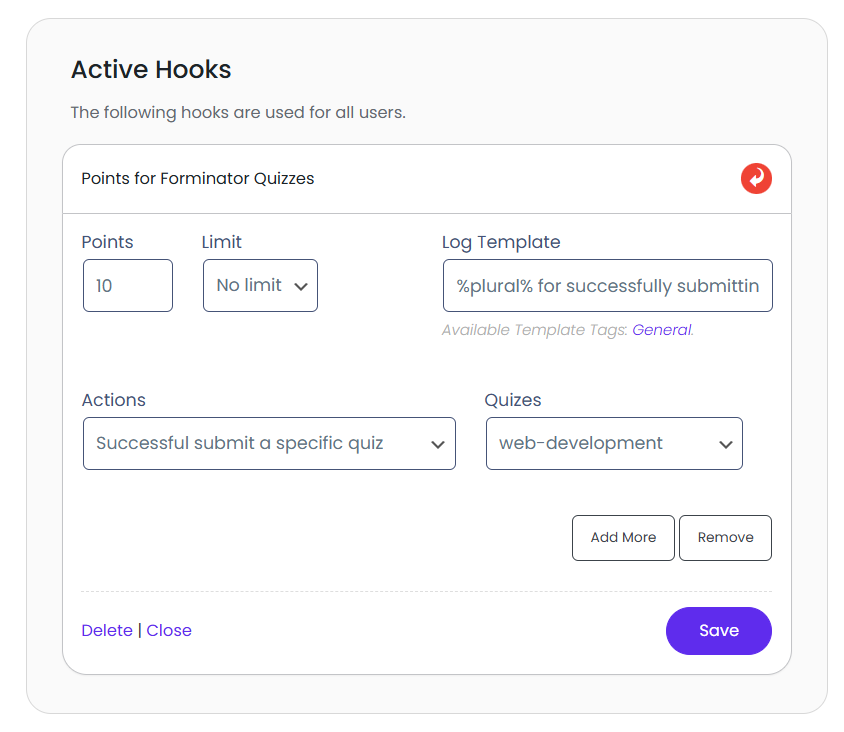 - It allows you to reward users with points when the user submits a specific field value on a specific quiz