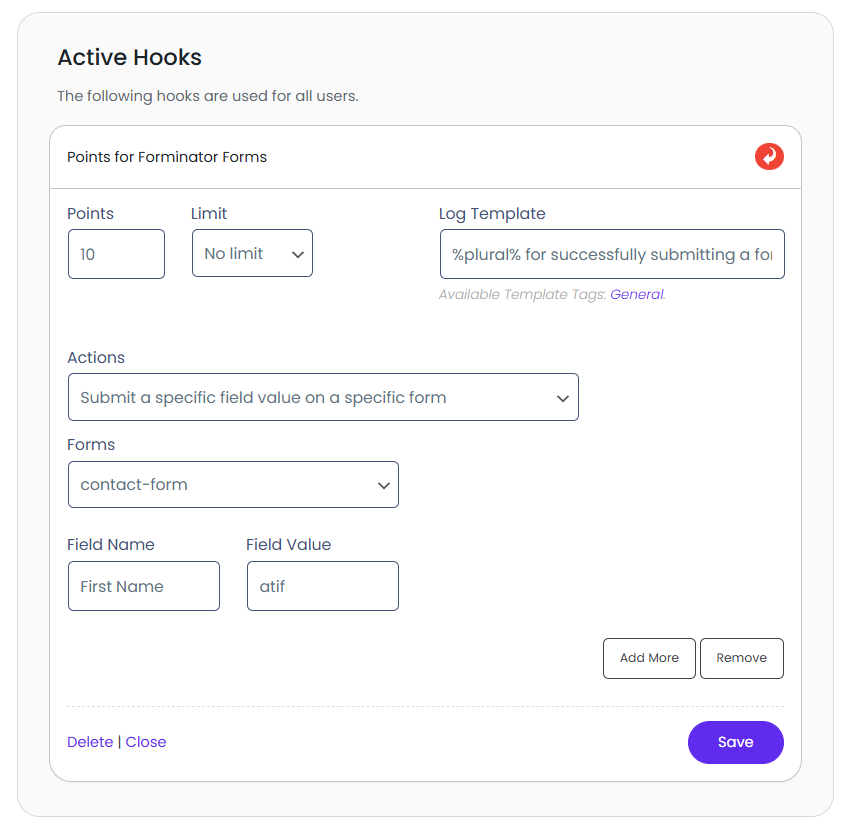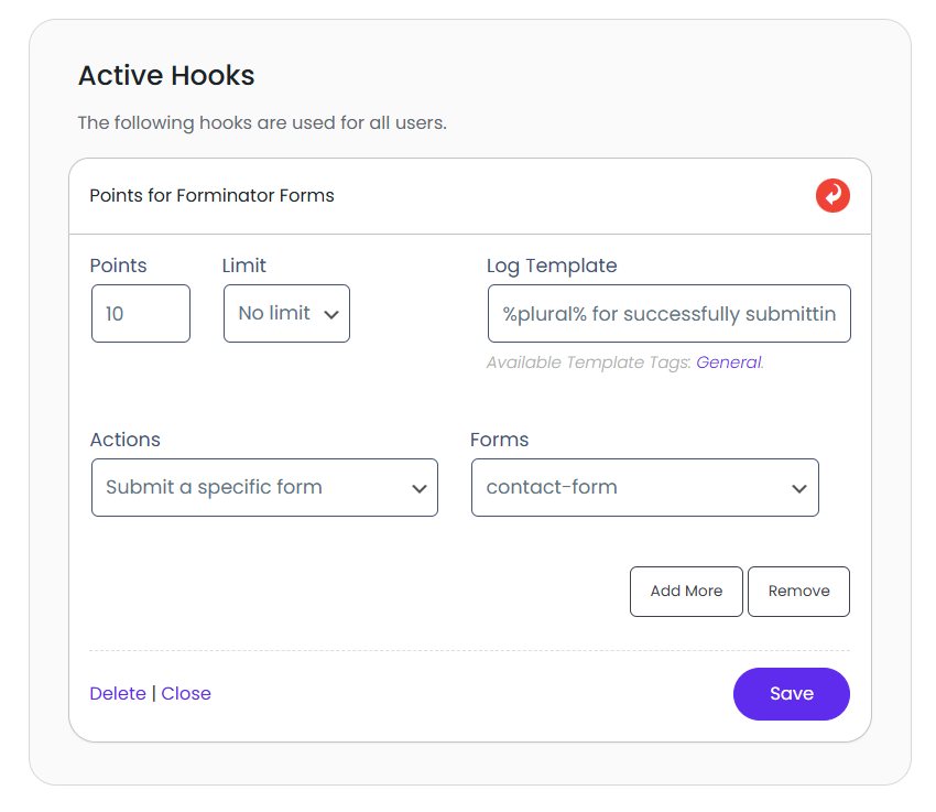 - It allows you to reward users with points when the user submits a specific field value on a specific form