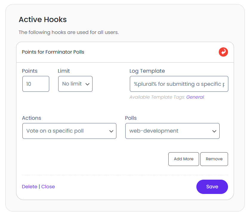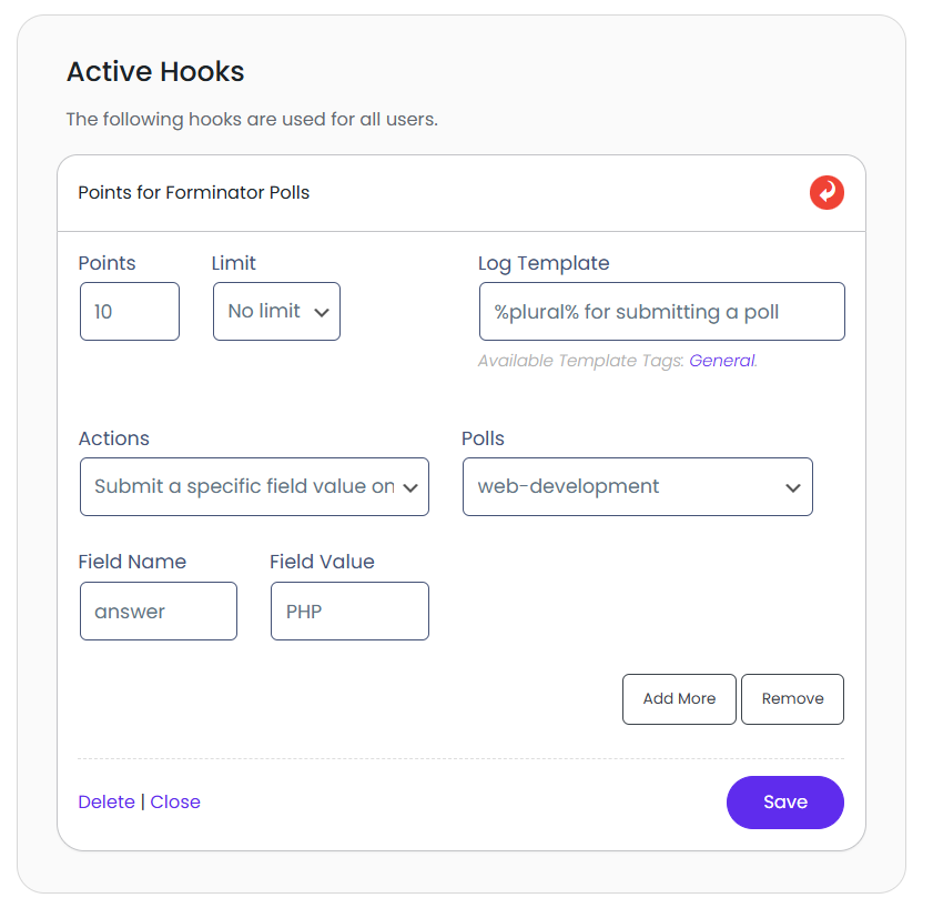 - It allows you to reward users with points when user submits a specific field value on a poll