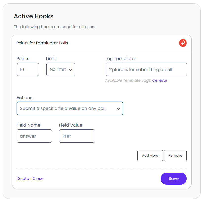- It allows you to reward users with points when user submits a specific field value on a specific poll