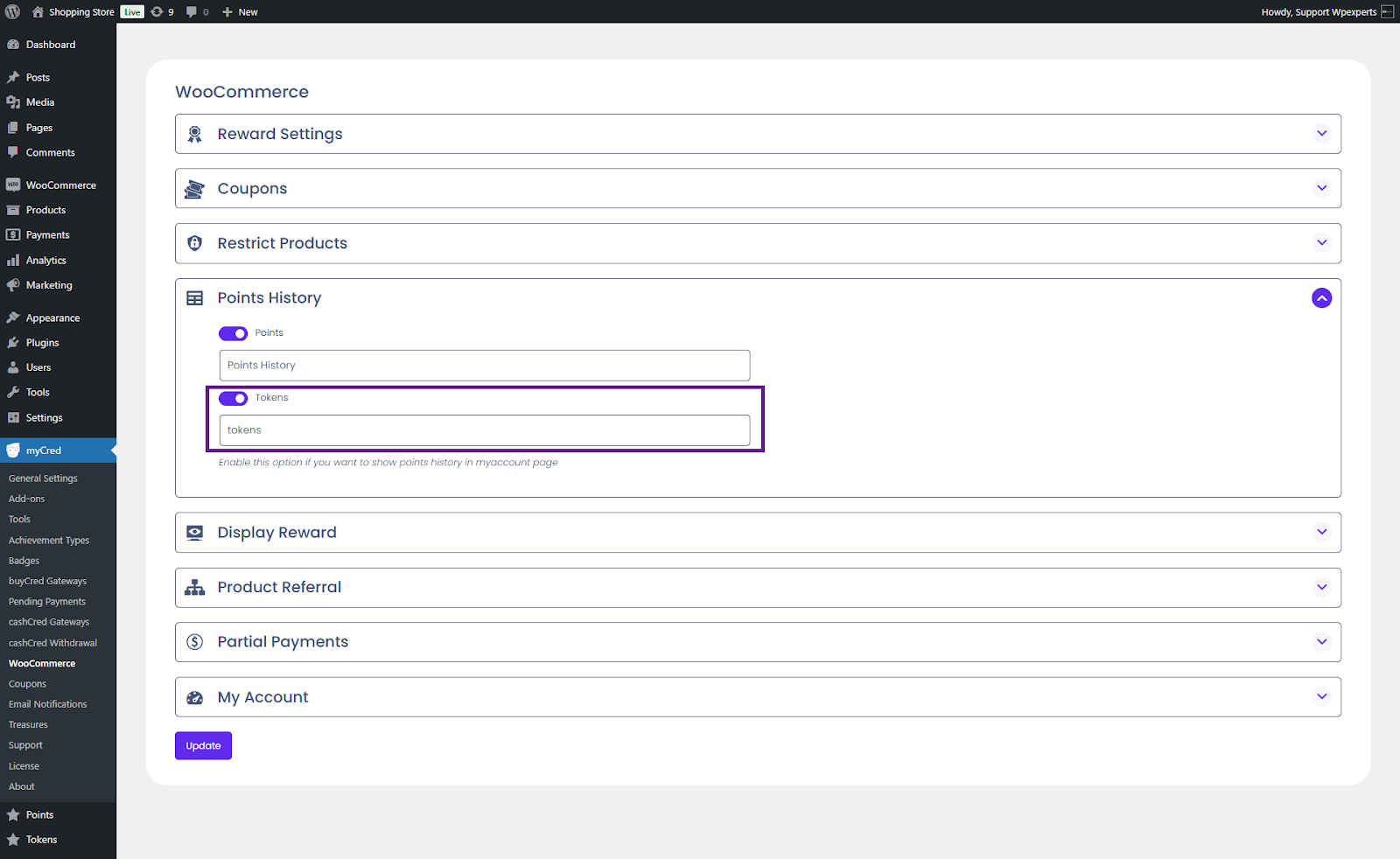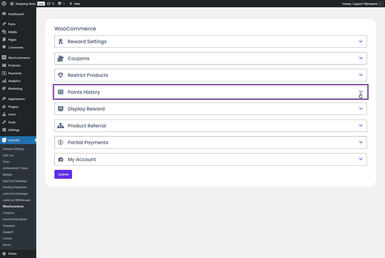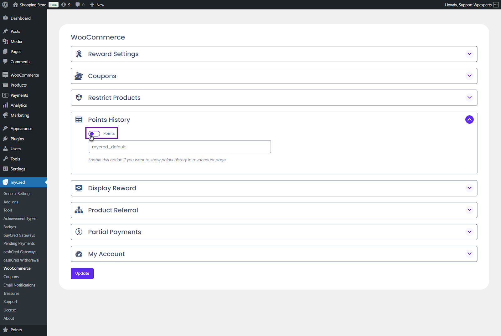 - Go to the Admin Dashboard > myCred > WooCommerce.