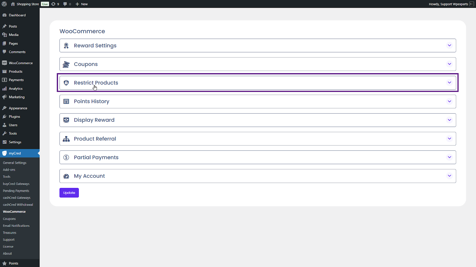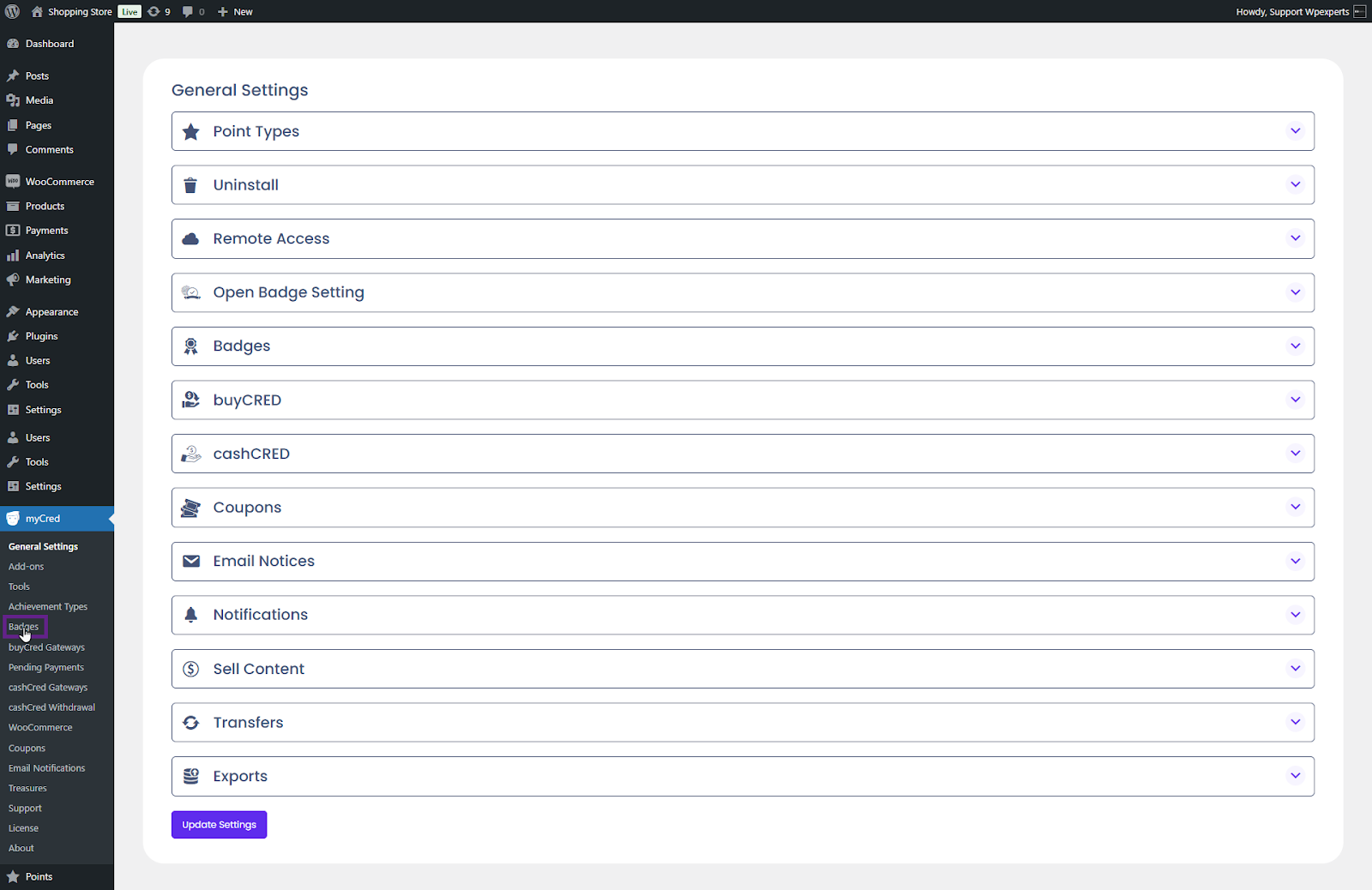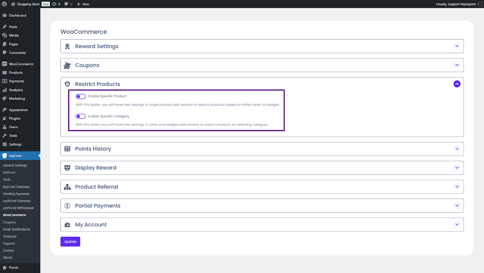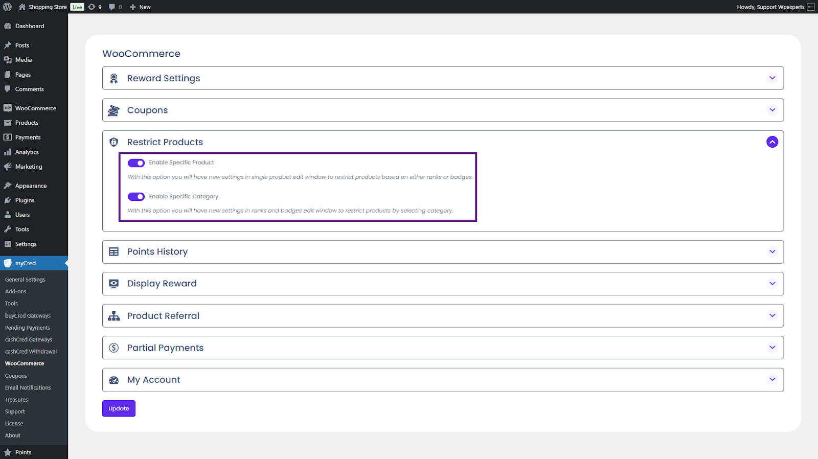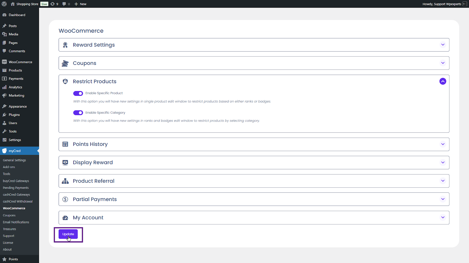 - Go to the Admin Dashboard > myCred > WooCommerce.