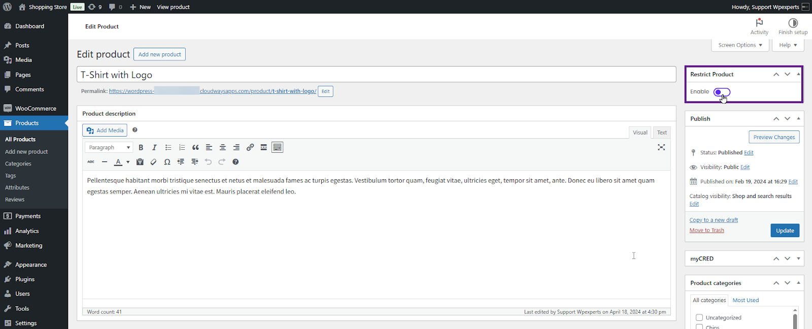 - Under the Restrict Products section, the admin can restrict access to specific products and categories.