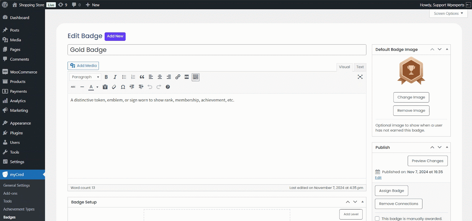 - Navigate to the Admin Dashboard > myCred > Badges.
