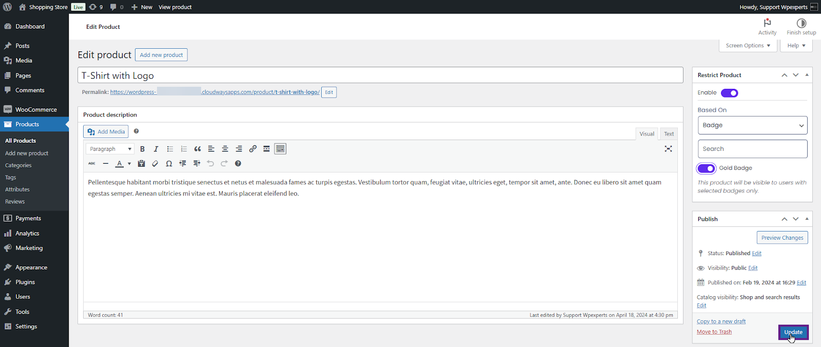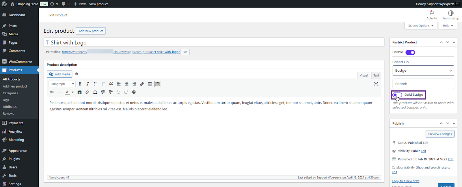 - Next, select the badge so that the product will only be visible to users with the enabled badges.