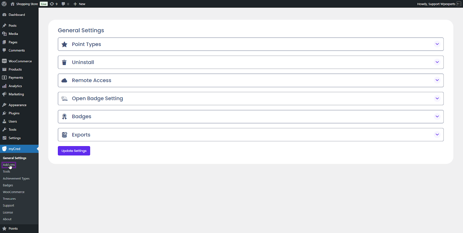 - Go to the Admin Dashboard > myCred > Add-ons.