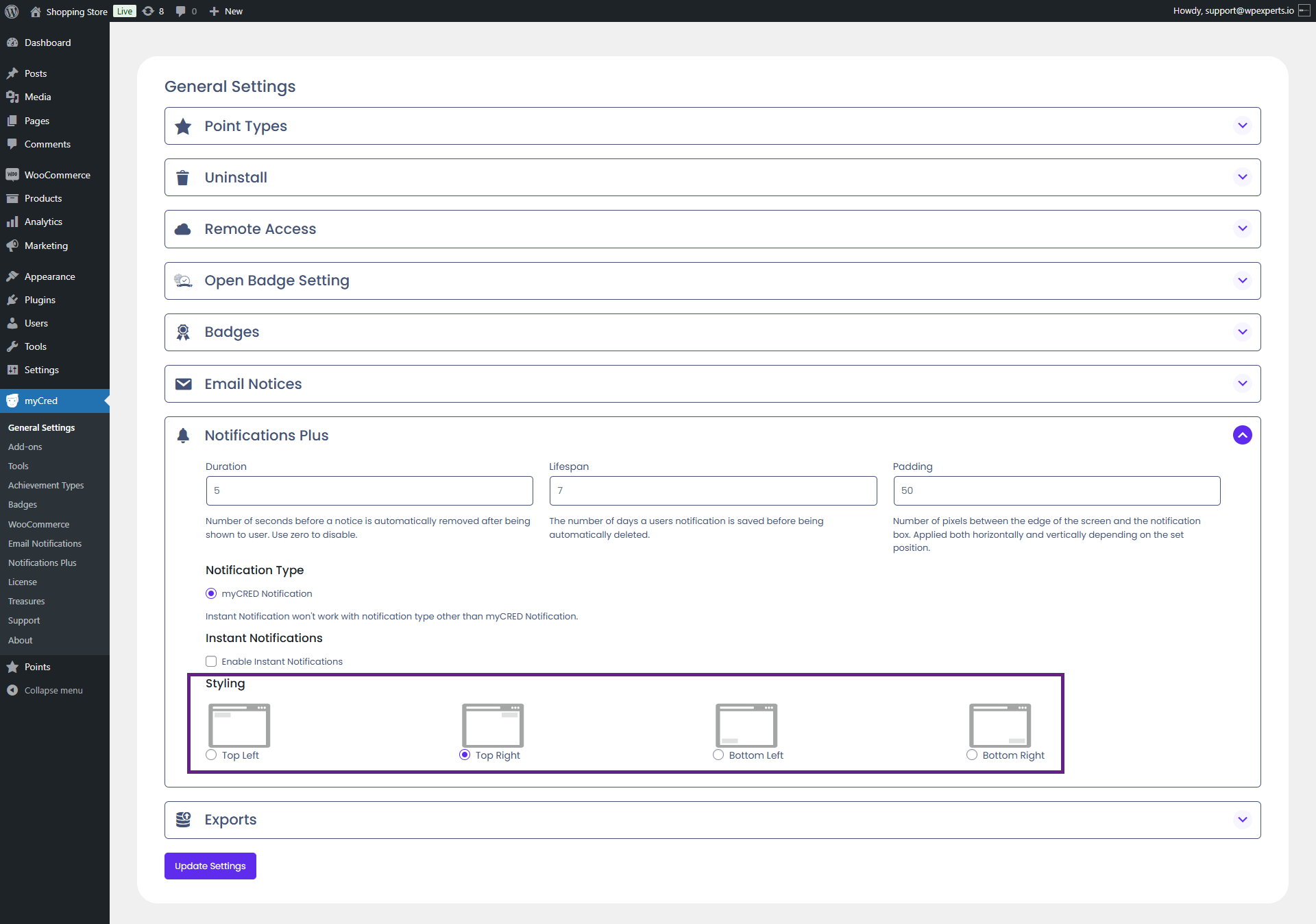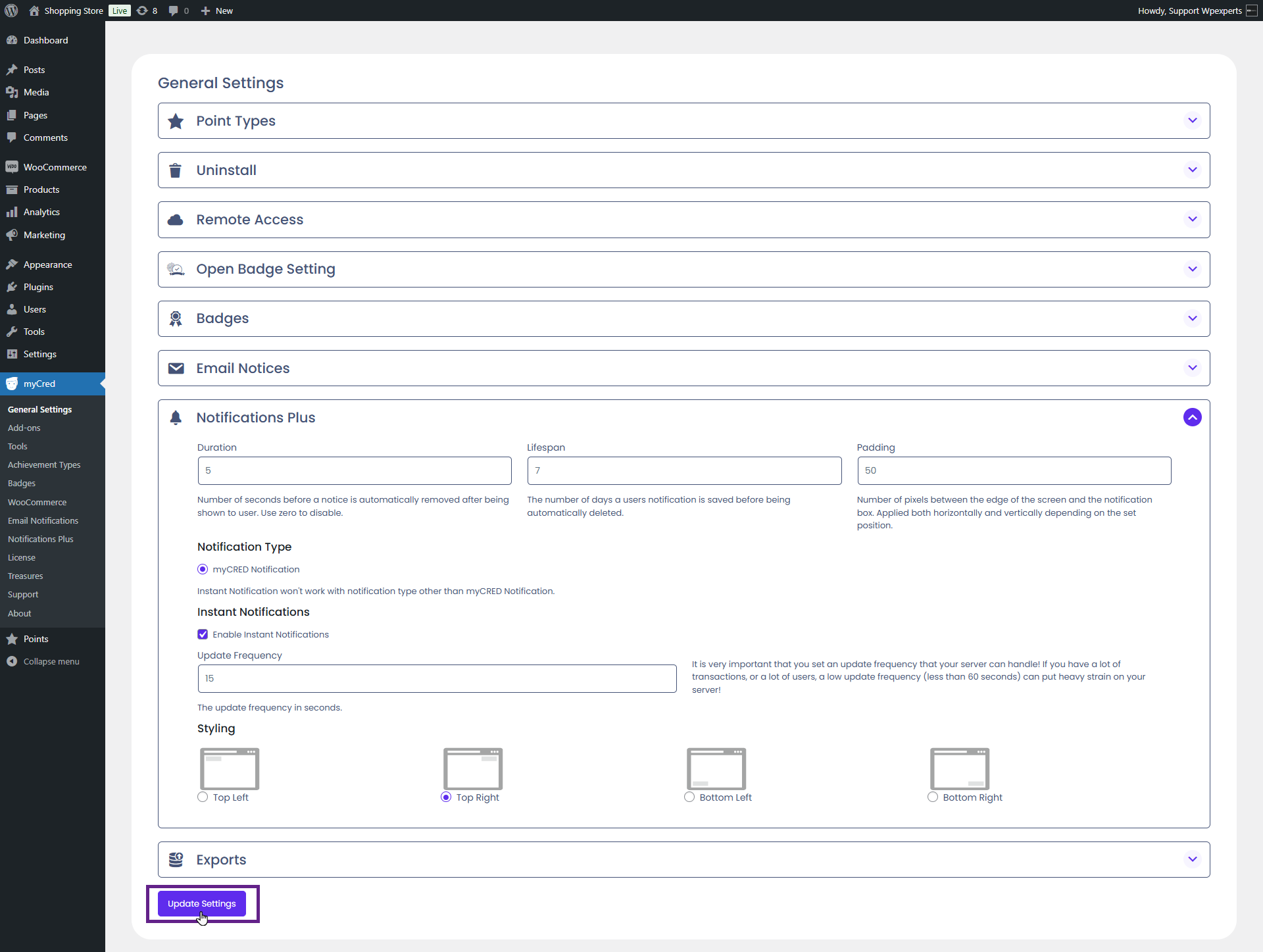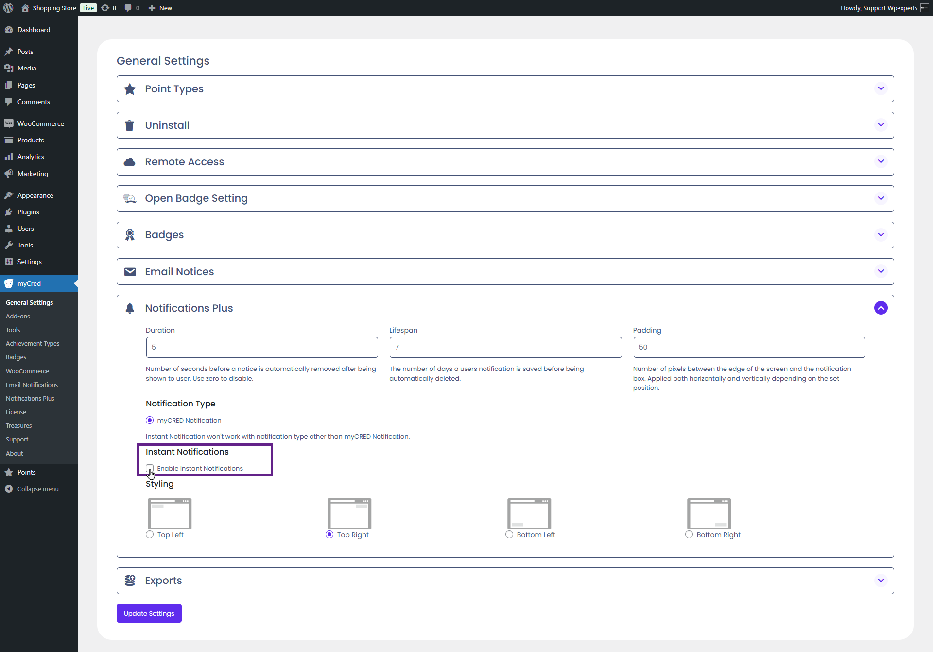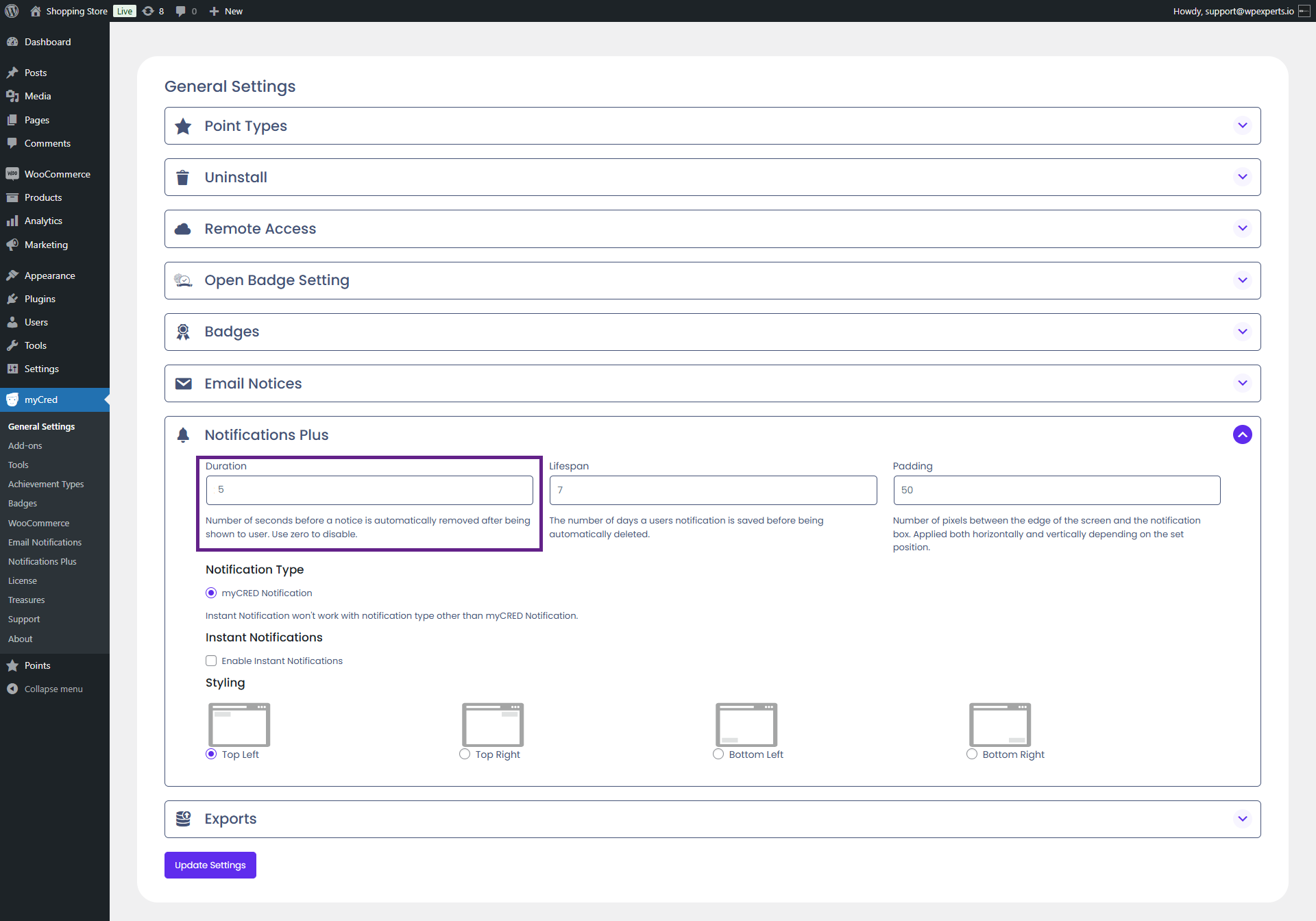 In the myCred General Settings section, the admin can configure the duration, enable instant notifications, and more.