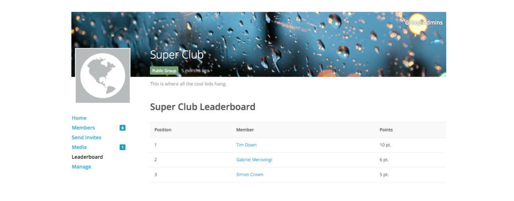 This plugin allows you to create leaderboards for your BuddyPress groups, based on the group members’ points history or balance.