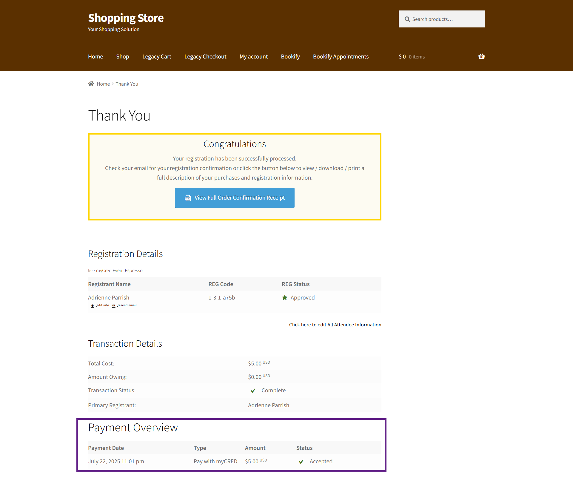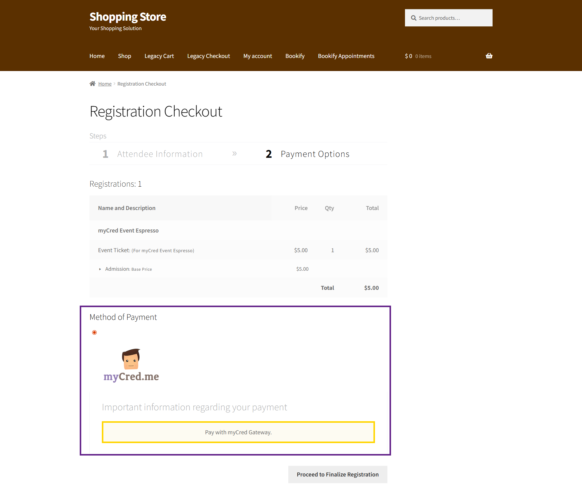 - Click the Proceed to Finalize Registration button to complete your order using the mycred payment gateway.