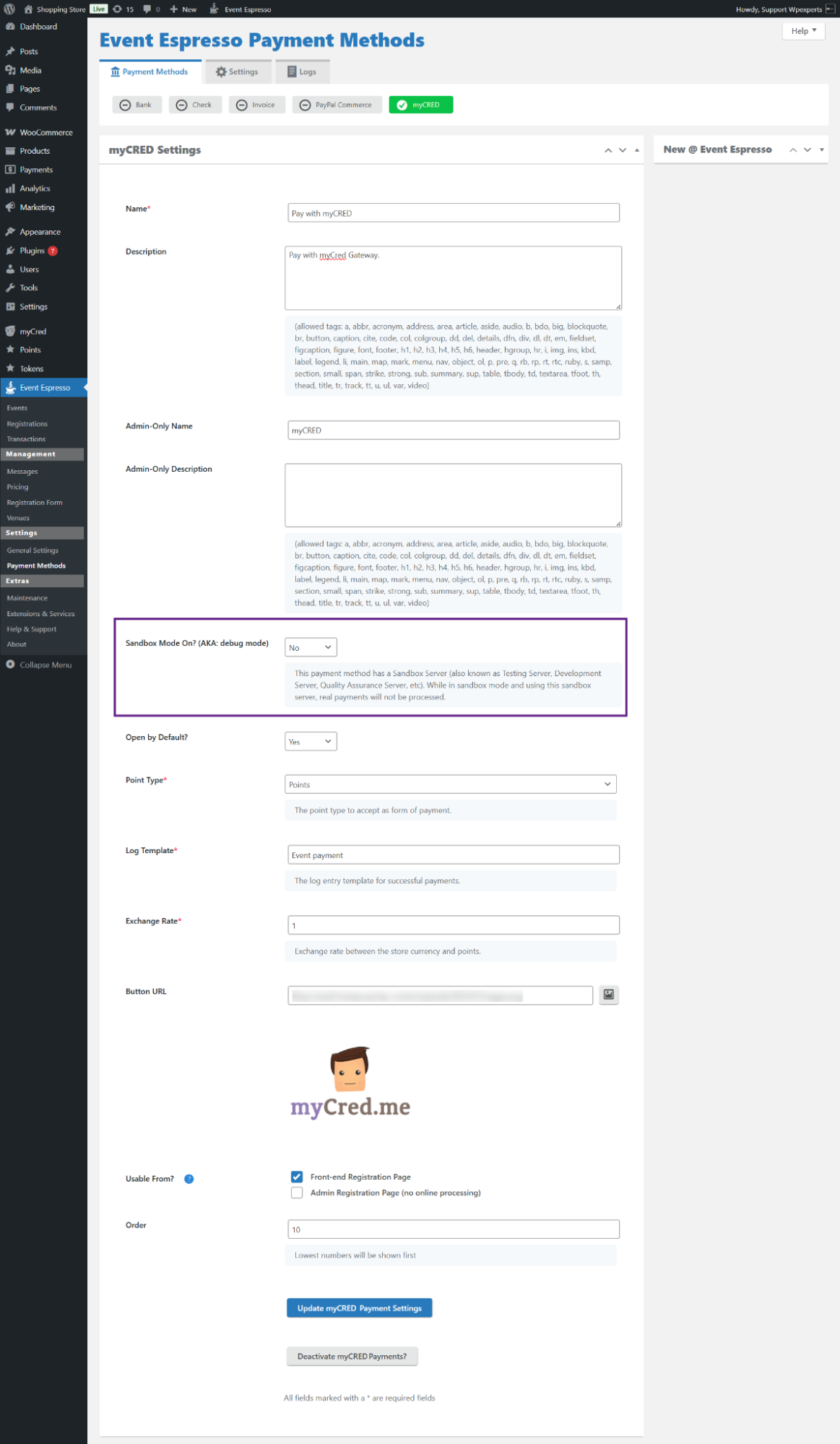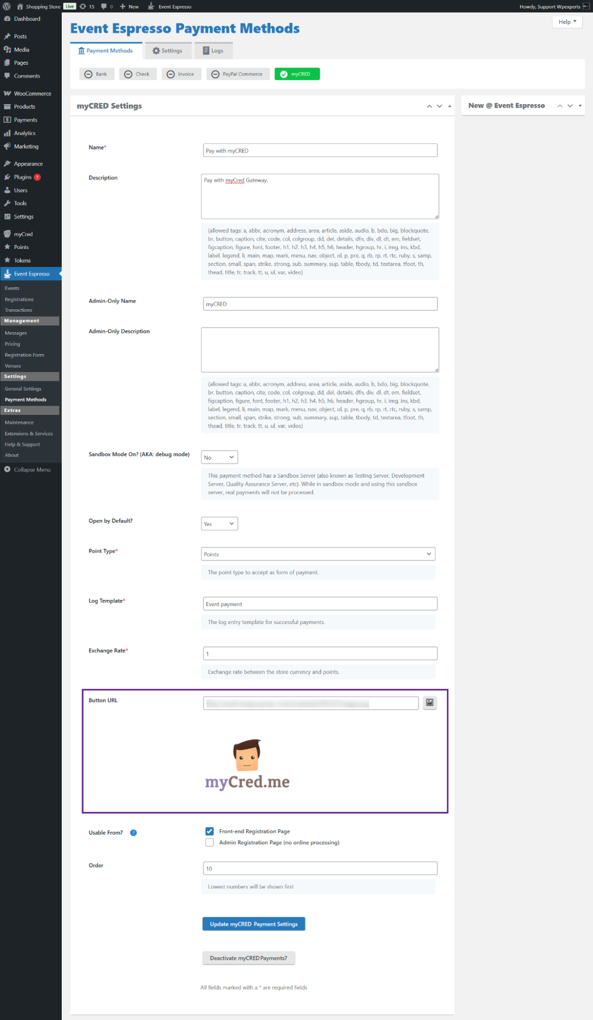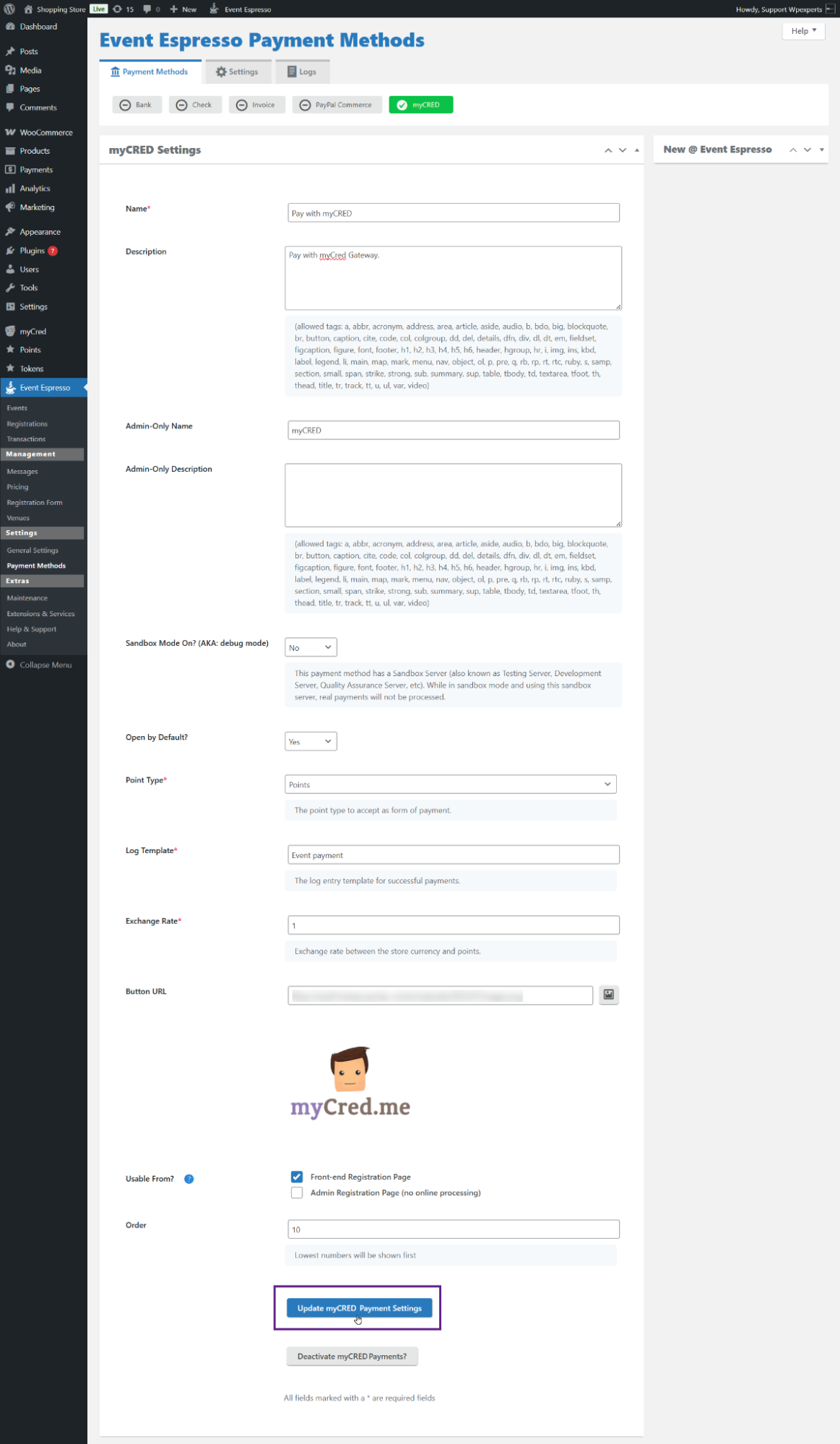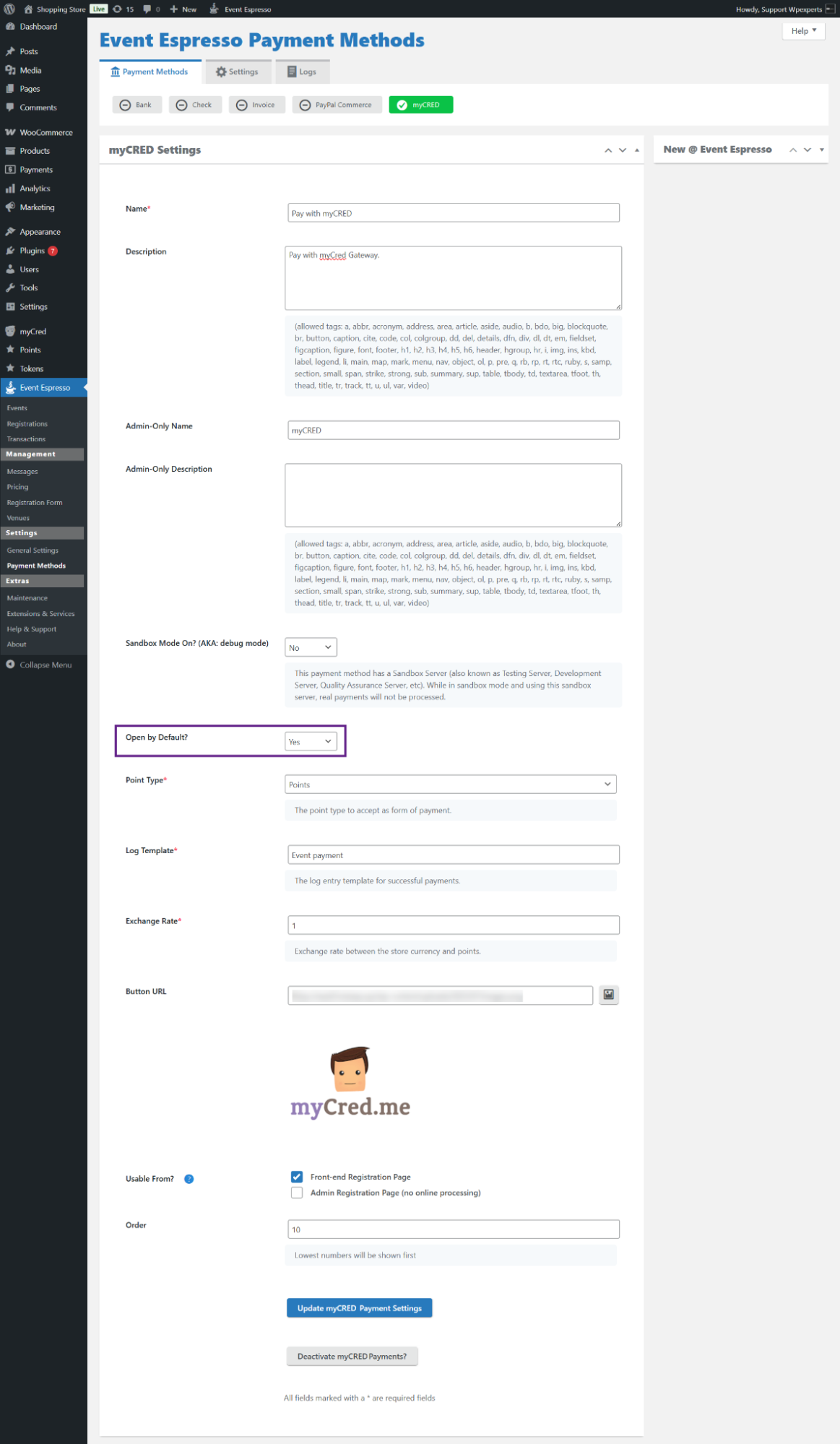 - Click the Activate myCRED Payment Method? option to activate the payment method.