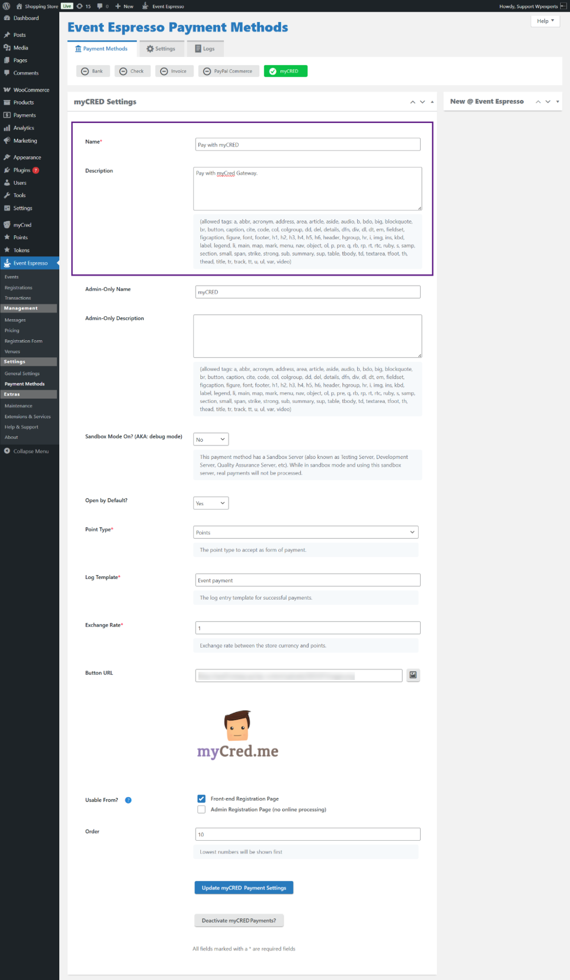 - Now, enter the admin-only name and description. These will appear as the label and text for the myCred subtab under the Payment Methods settings.