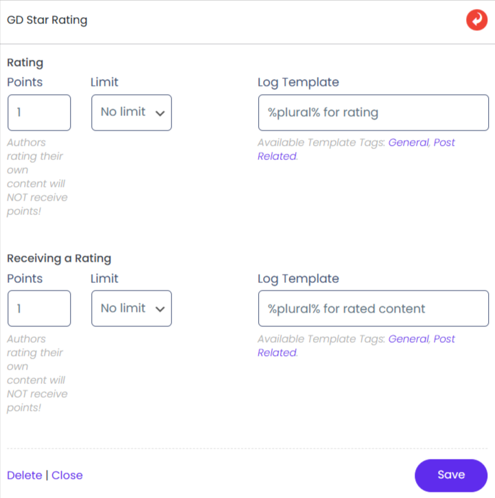 - Admins can set how many points a user can get when rating a post and set limits on how many intervals the user can get points.