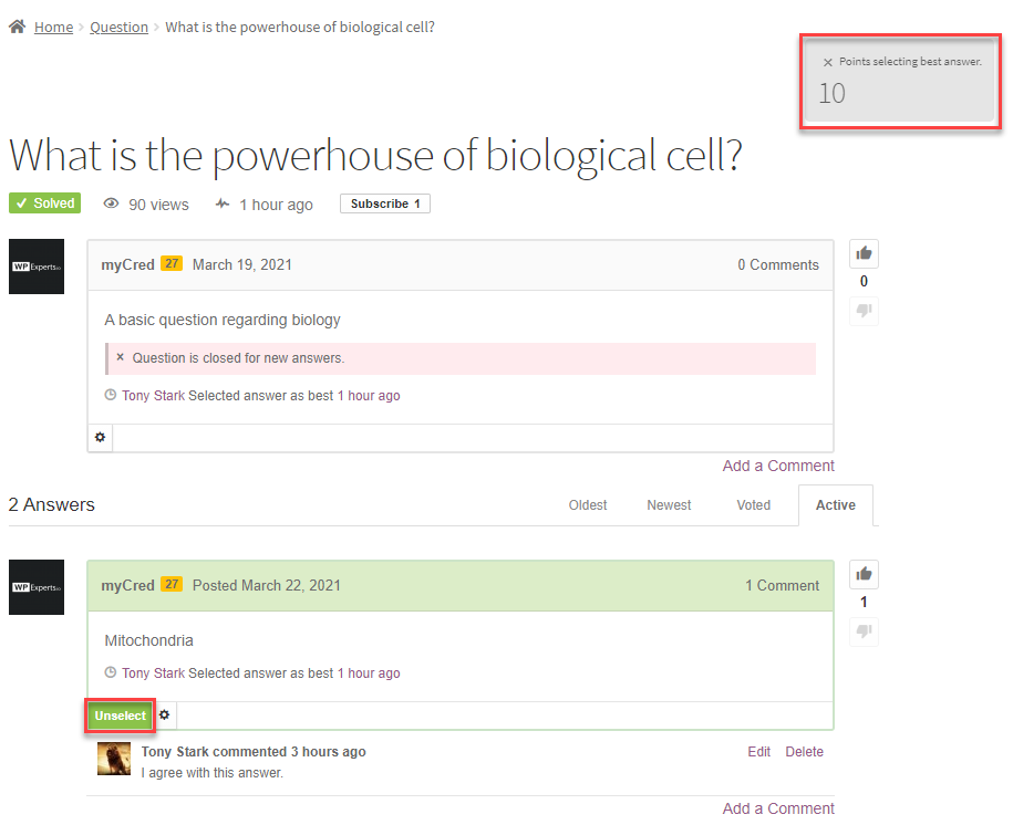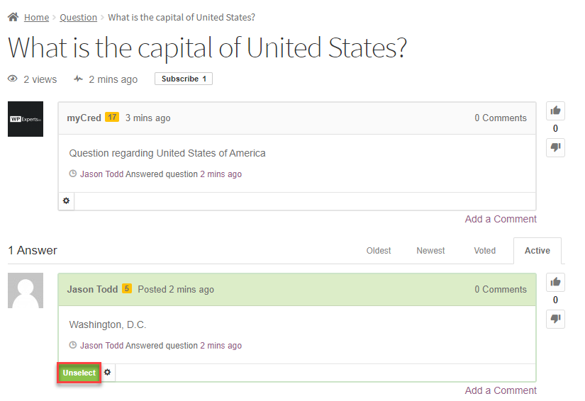 - Once done, the option would turn into Green color and the label would be changed to Unselect (In case you want to choose another answer as the best answer).