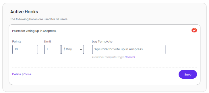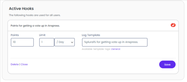 - This hook will award points to the user that has voted up a question or answer only.