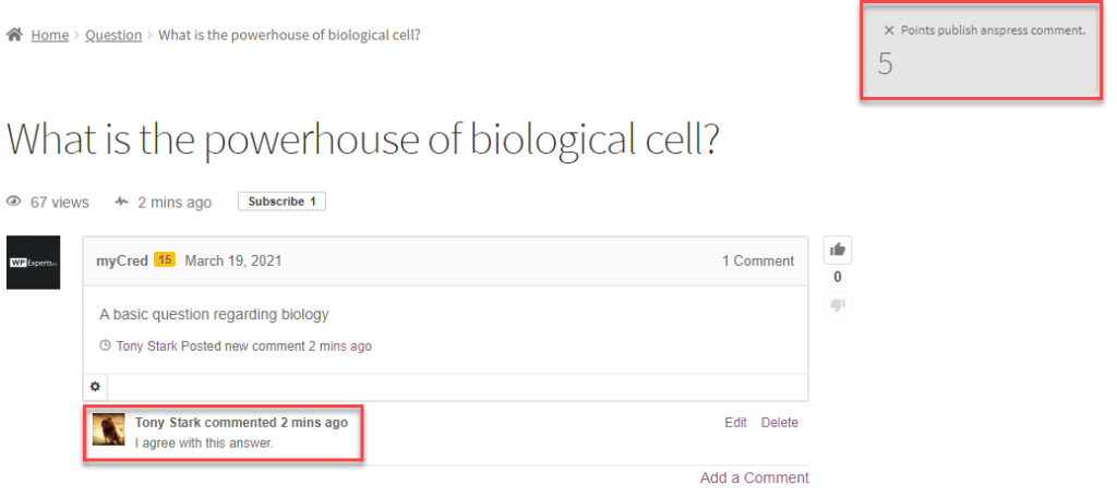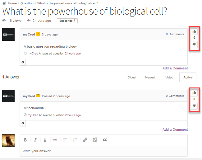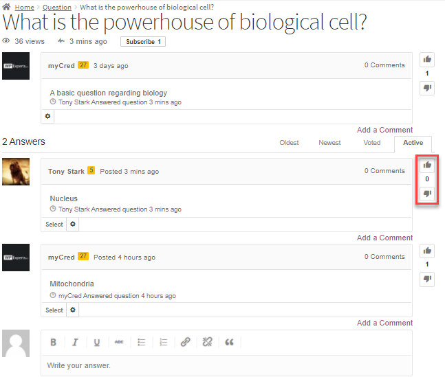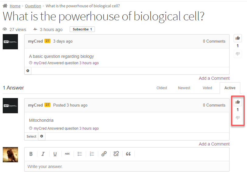 - The User will then click on the Thumbs Up button. (Here the user just clicked on the Thumbs Up button of the Answer Box published by user name myCred).