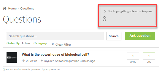 - This hook will award points to the user that published a question or answer using the Anspress platform only, not the user who voted up the respective question or answer.