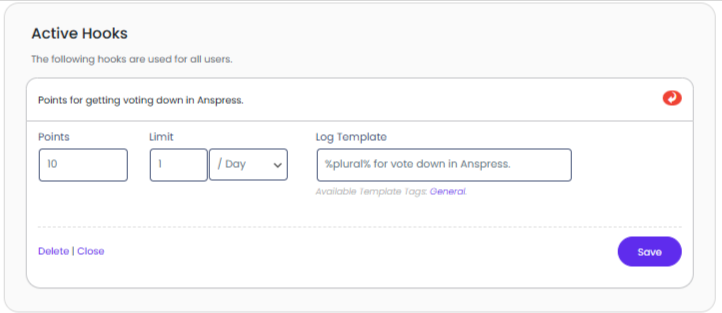 - The function of this hook is that when it’s activated then the plugin will award/deduct points from the user who gets votes down on question/answer published by other users using the Anspress platform