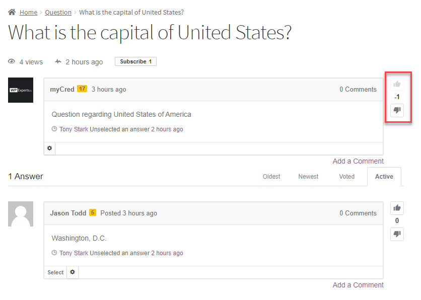 - The User will then click on the thumbs-down button. (In the screenshot given below, the user just clicked on the Thumbs Down button of the Question Box published by the user name myCred).