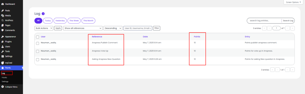 - Go to Admin Dashboard > Points > Logs