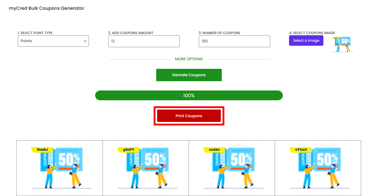 myCred Coupon Plus allows you to create, customize, and personalize your coupons in bulk. You can also upload the coupons via a CSV file and send them to customers via email.