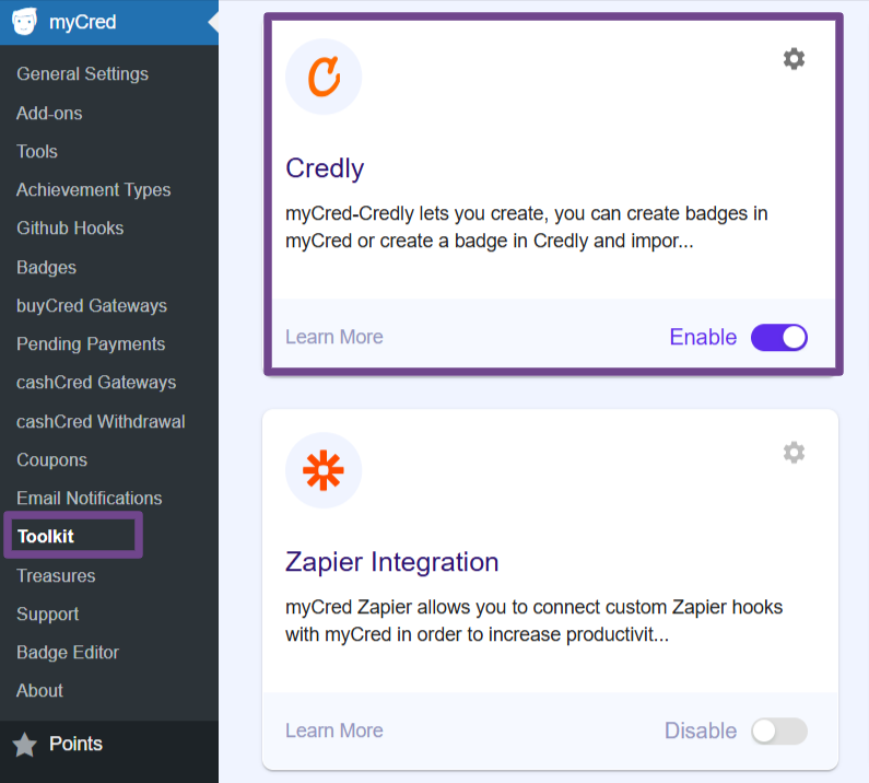 - Navigate to WordPress admin Dashboard > myCred > Toolkit