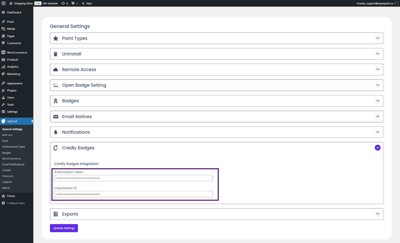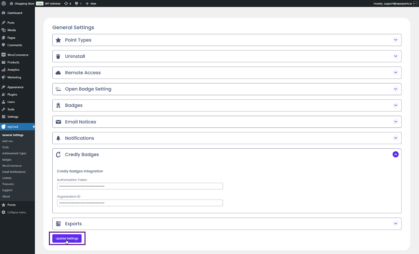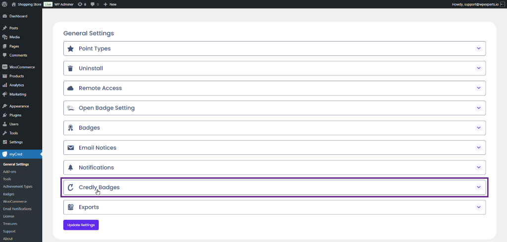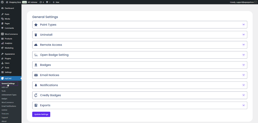 - Once done, go to Admin Dashboard > myCred > General Settings.