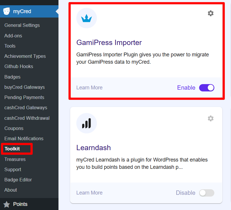 - Navigate to WordPress admin Dashboard > myCred > Toolkit
