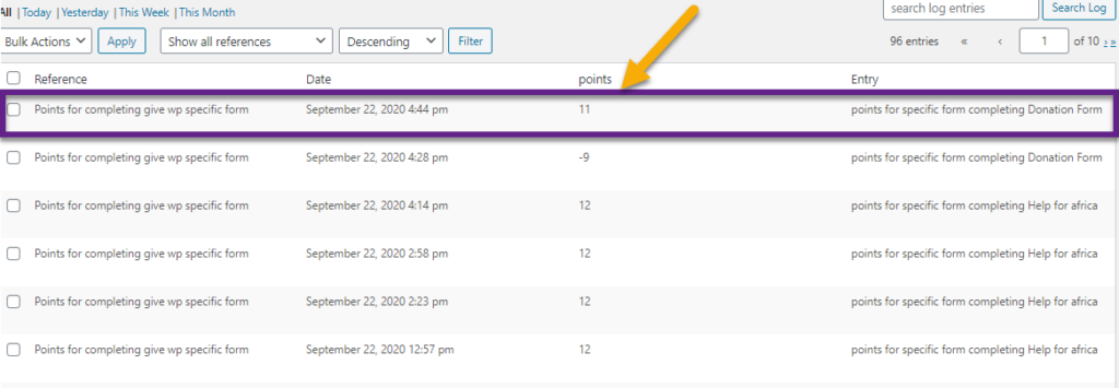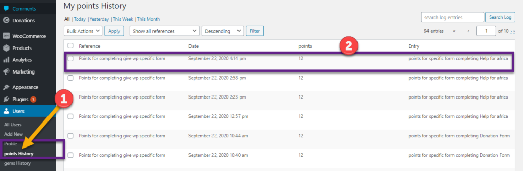 In ‘Profile History’ user can see that ’10’ points have been rewarded against this donation