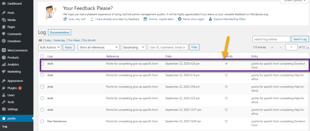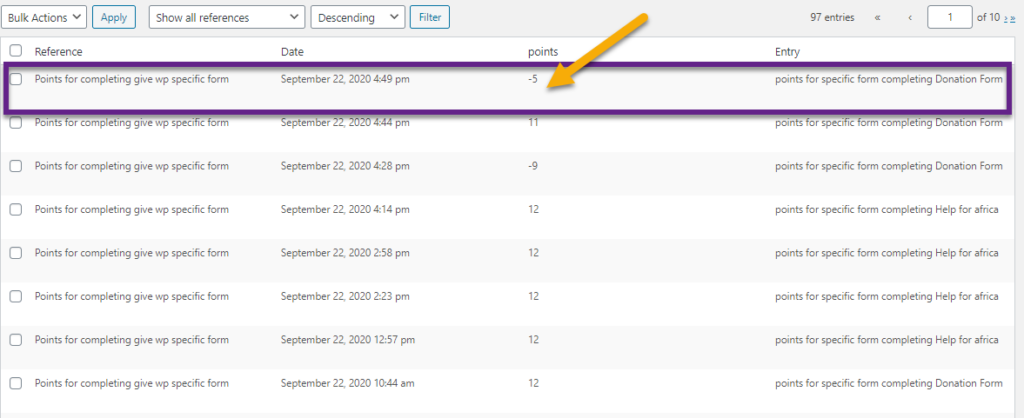 If you want to set the case of point deduction then in ‘points’ field put your desired value with ‘-ve’ sign