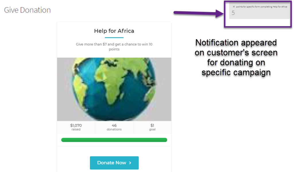 In this scenario ‘5’ points will be rewarded to the customers, if they will donate on a ‘Specific campaign’