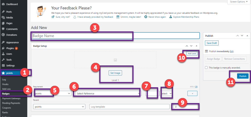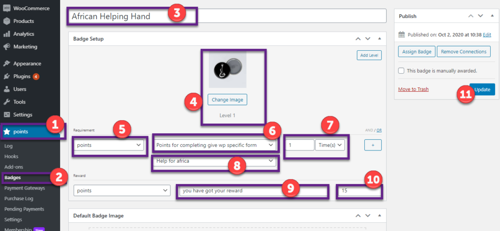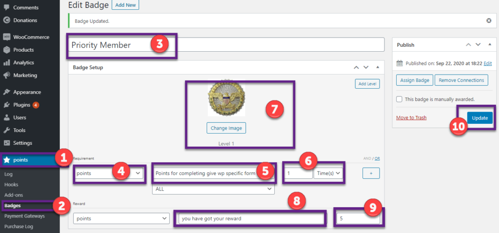 - Set ‘no of points’ which will be rewarded on achieving badge