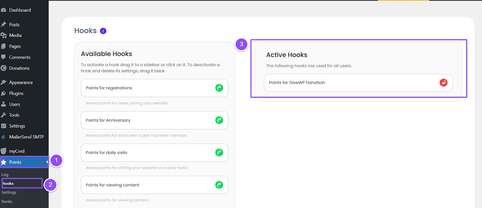 Drag ‘Points for GiveWP Donation’ in Active Hooks