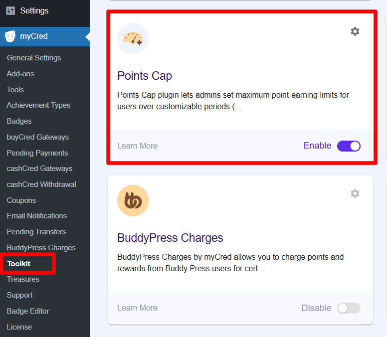 - Navigate to WordPress admin Dashboard > myCred > Toolkit
