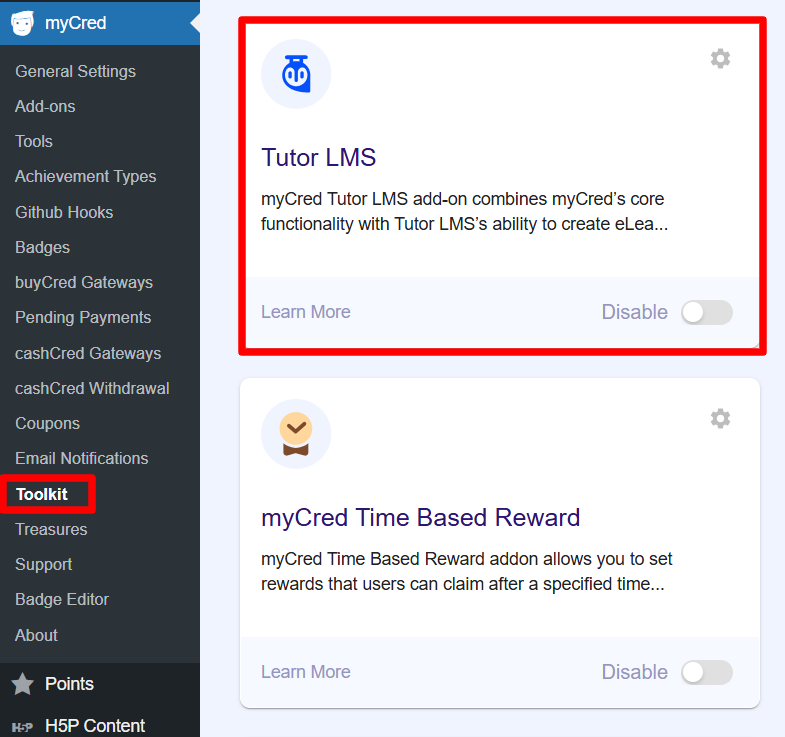 - Navigate to WordPress admin Dashboard > myCred > toolkit