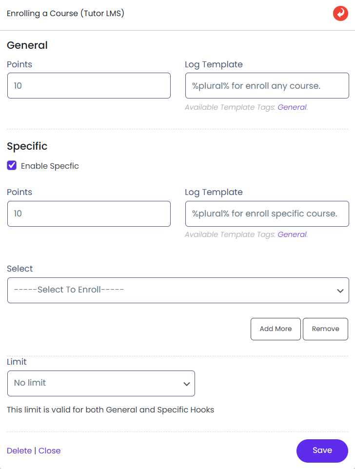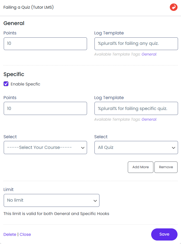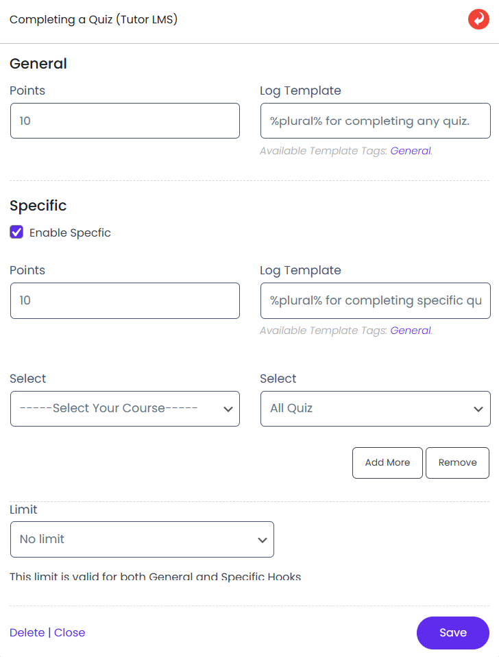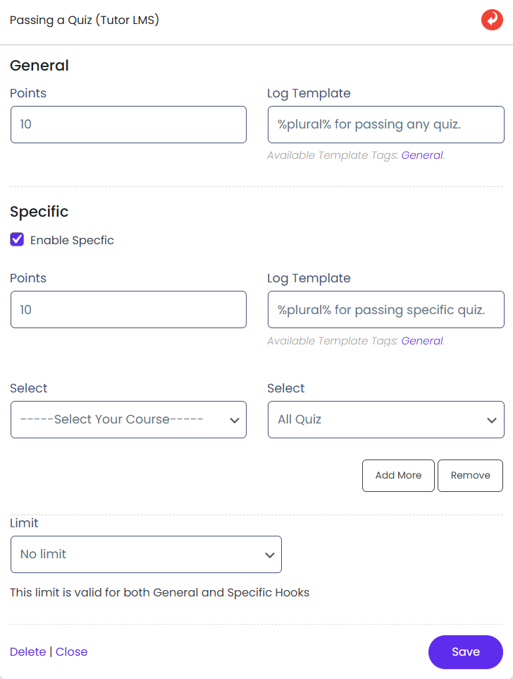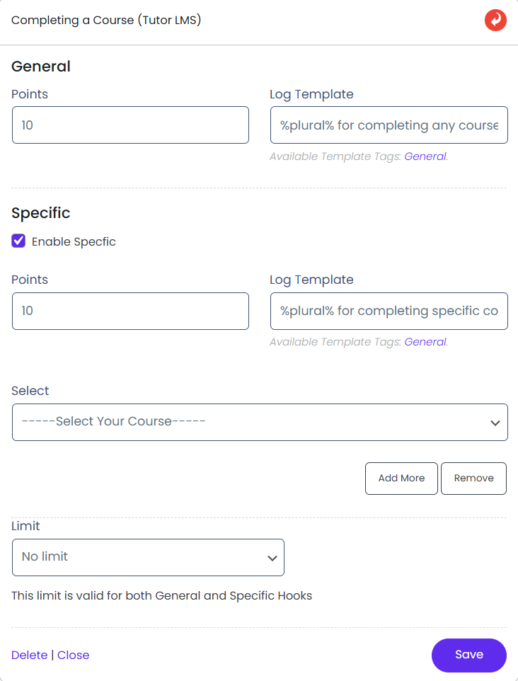 NOTE: The Notification Add-on of myCred will not function on the Completing a Course (Tutor LMS) hook. However, the log will be generated once the event is triggered.