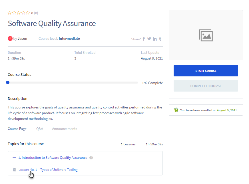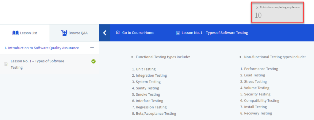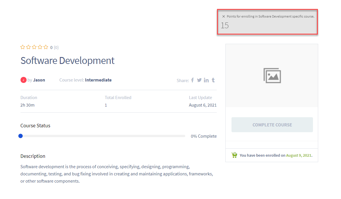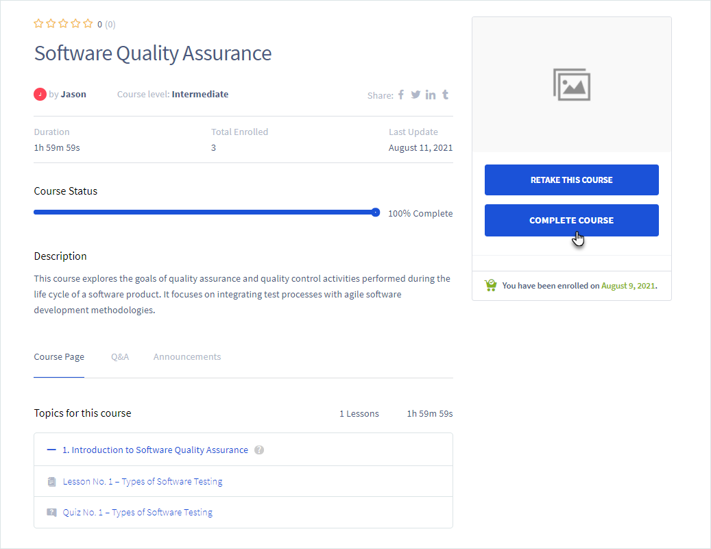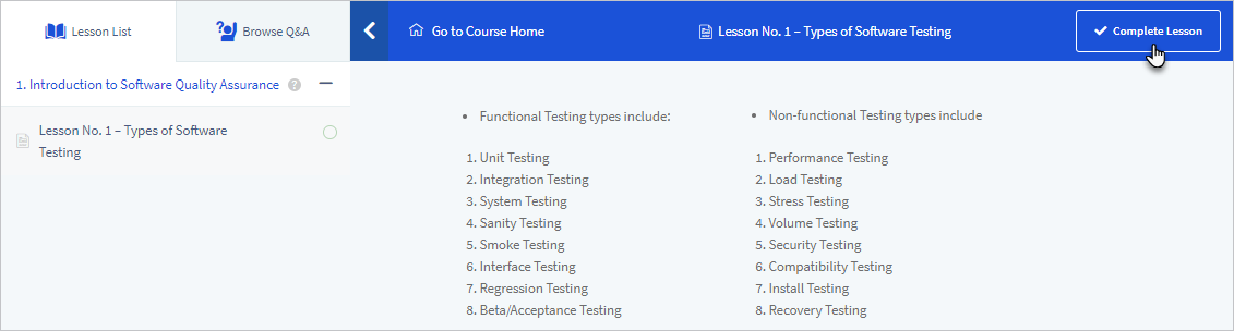 - Once the user has completed all the activities of the course, the user will click on the Complete Course button.