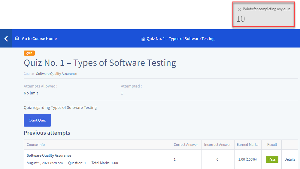 - If the user passes the quiz, he/she will be awarded points for Passing a Quiz.