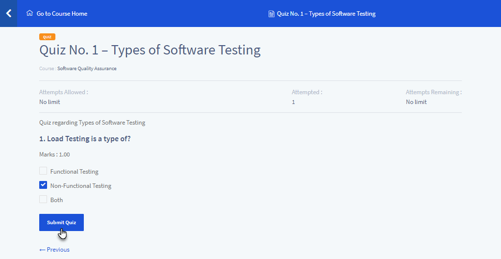 - Once the user completes the quiz, he/she will click on the Submit Quiz button.