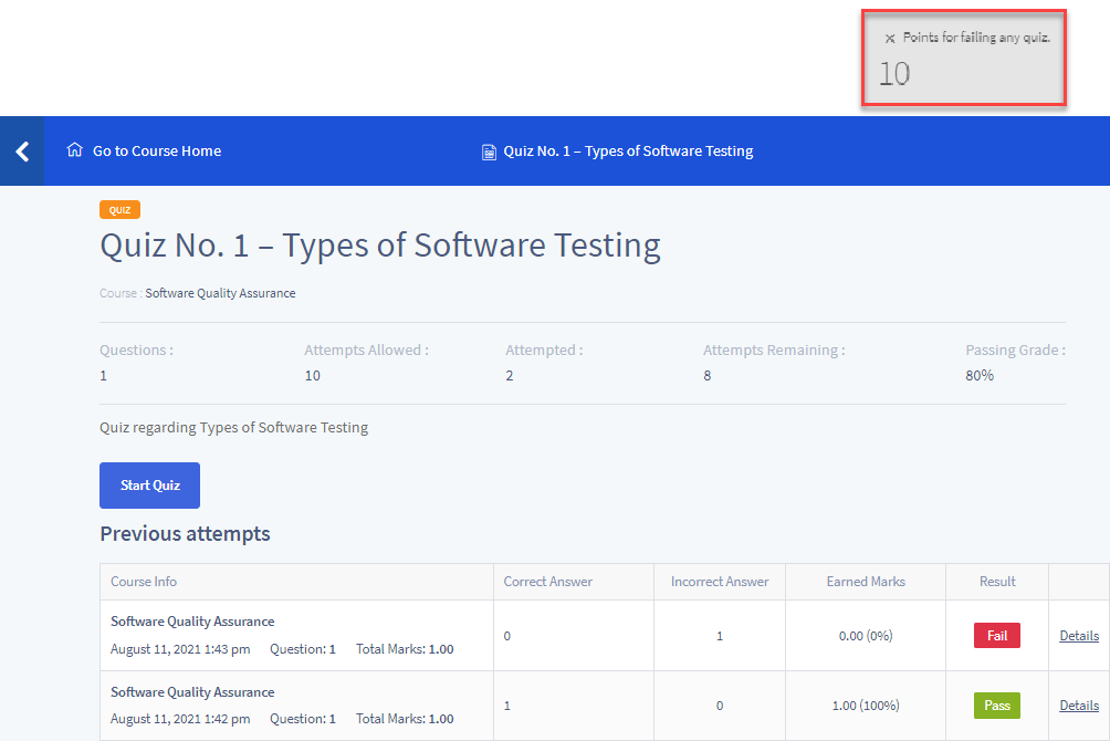 - If the user fails the quiz, he/she will be awarded points for Failing a Quiz.