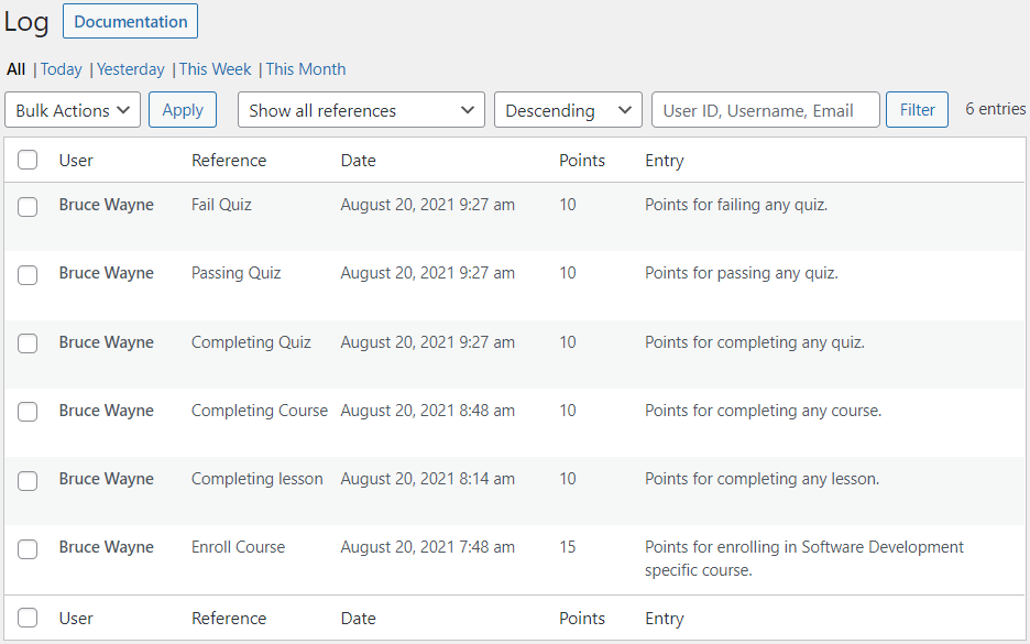 All the details like User, Reference, Date, Points, etc of the event are present here.