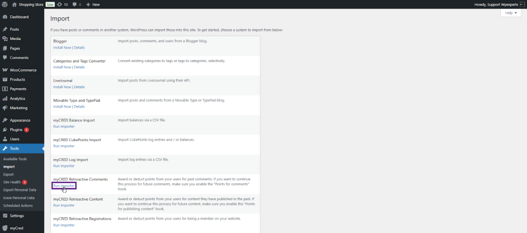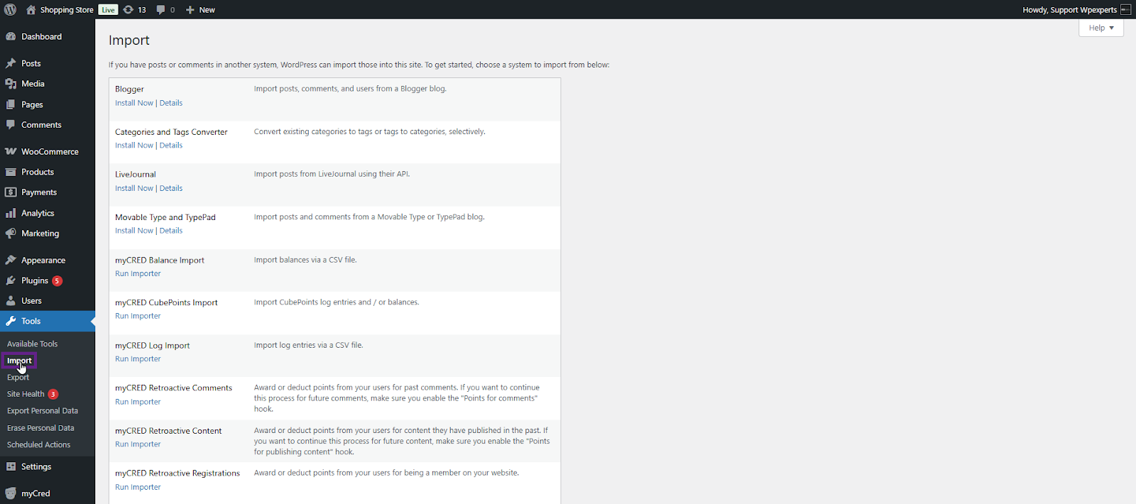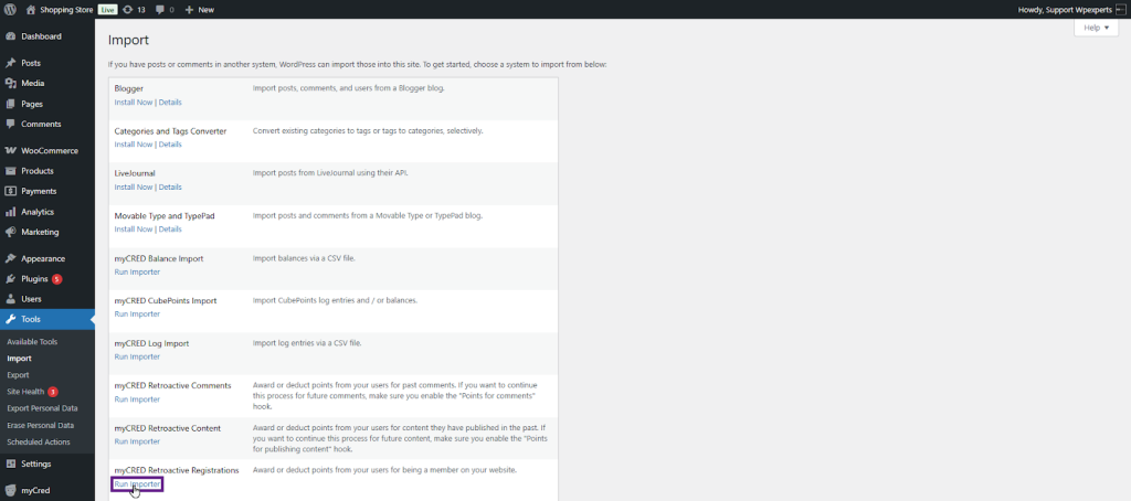 - Once done, navigate to the Admin Dashboard > Tools > Import.