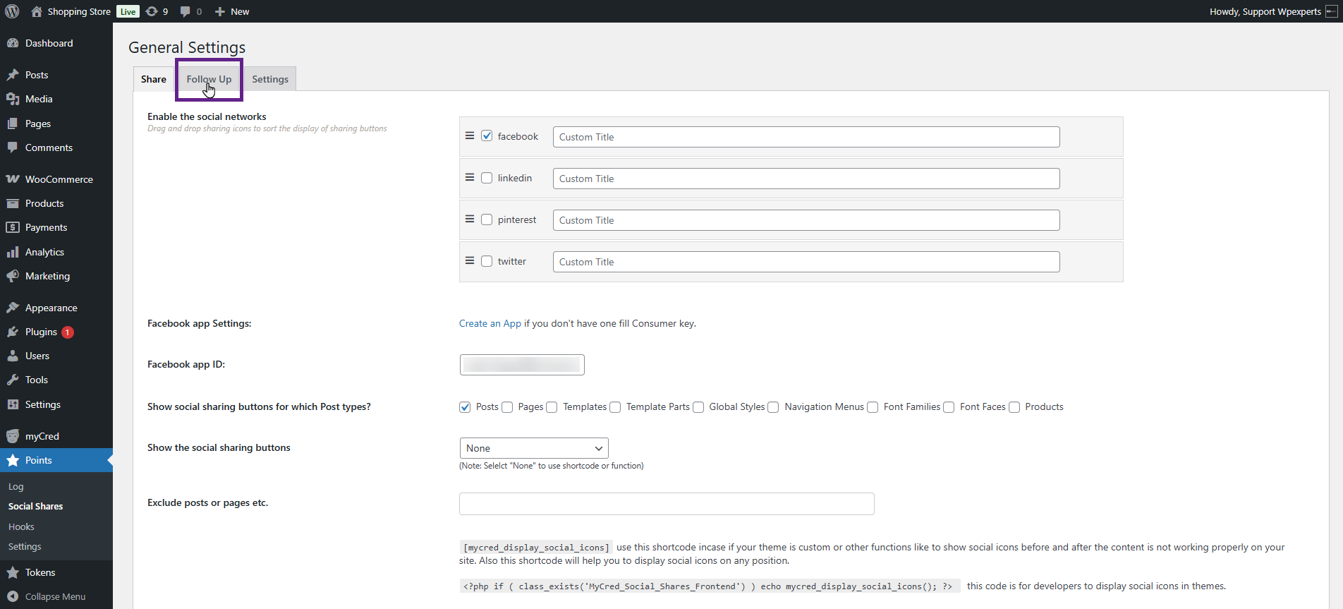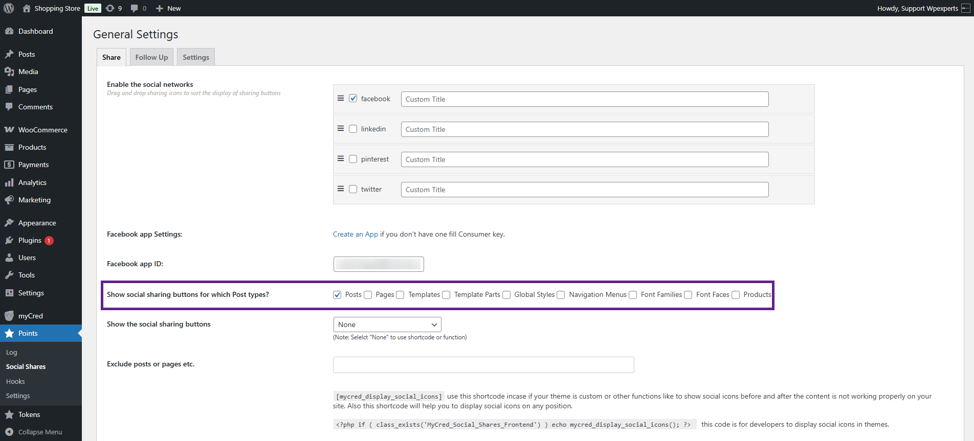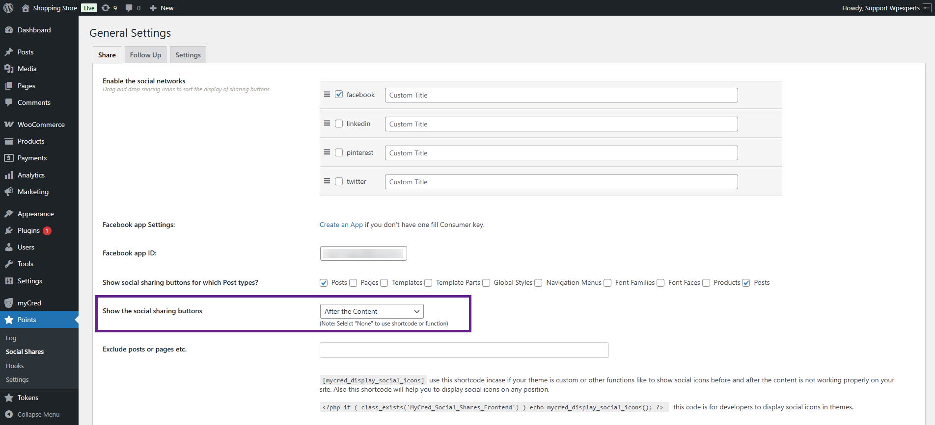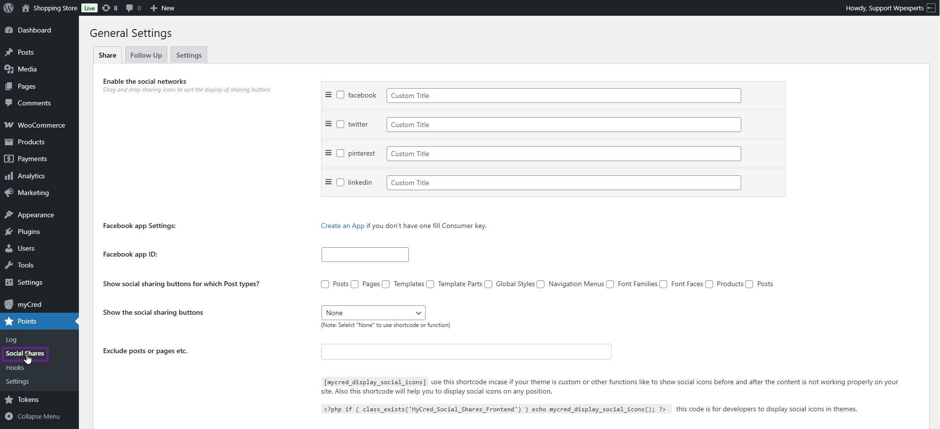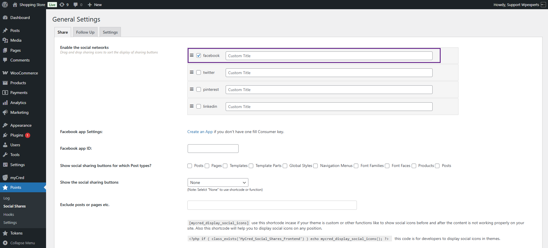 - Now, navigate to the Admin Dashboard > Points > Social Shares.