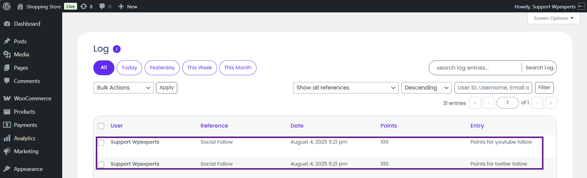 - When a user shares or follows a social account from the front end, they will be awarded points. As shown, the user has successfully received the points.