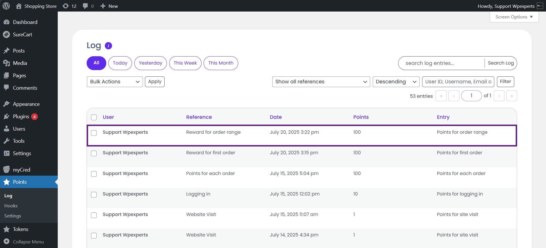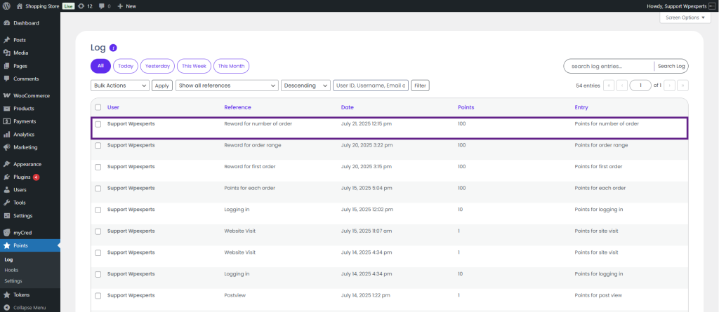 - Once the order is placed, the user will receive the points. This can be verified in the Points Type Log by navigating to Admin Dashboard > Points > Log.